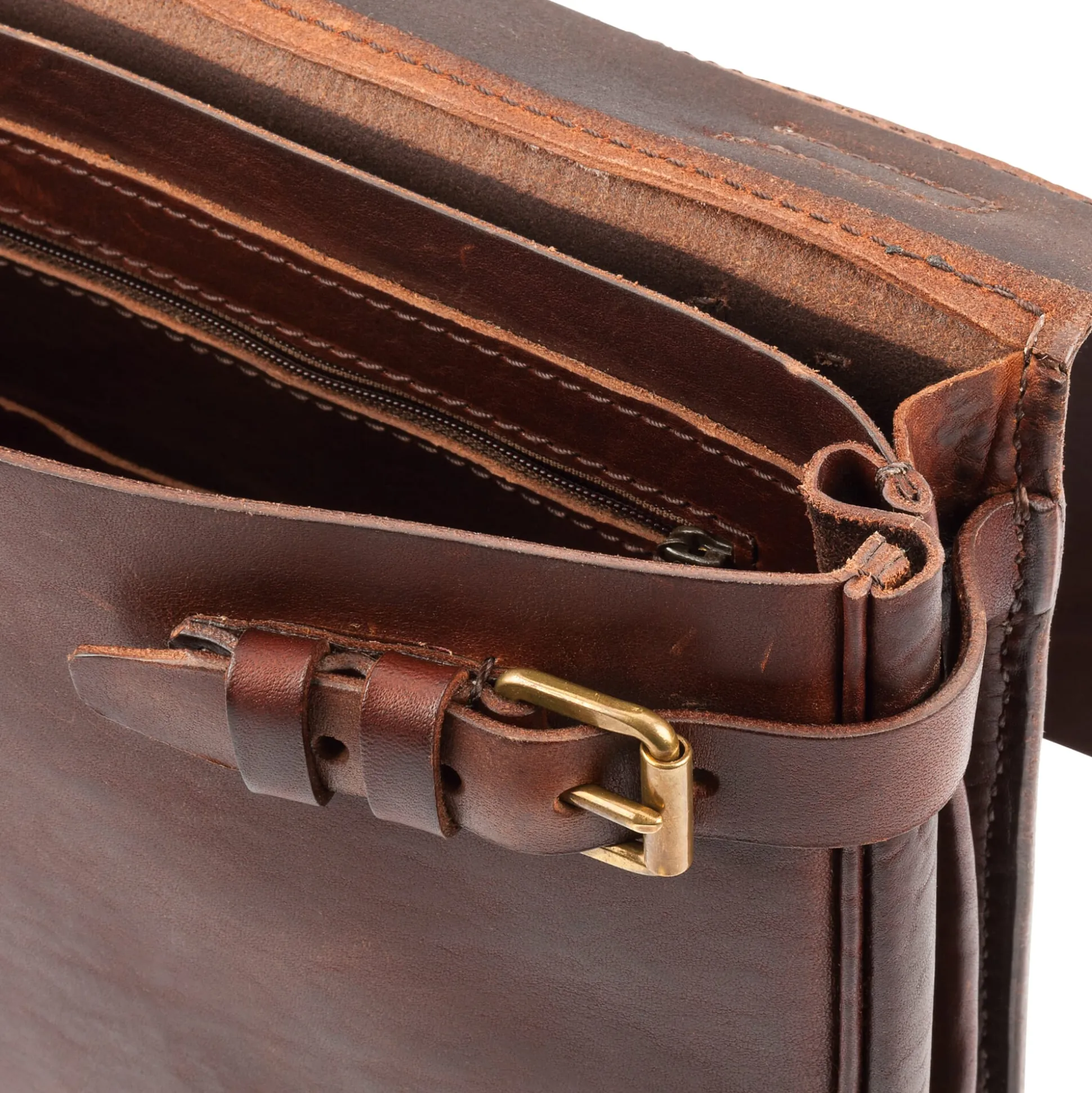 Dem klassischen Schulranzen ist diese handgefertigte Umhängetasche nachempfunden – doch ihre Lebensdauer wird wohl weit über i-Männchen-Zeit, Abschlussball und Professorenhut hinausgehen. Bis ins Detail ist sie auf Haltbarkeit gearbeitet. Das von Hand zugeschnittene stabile Rindleder – in einer Stärke von 3 mm – ist mit einem Sattlerstich vernäht. Das ohnehin sehr feste Garn wird dabei mit Bienenwachs bestrichen, sodass es zusätzlich mit dem Leder verklebt. In die lederne Flatterwand, die Struktur schaffend das Innenfach unterteilt, ist ein Reißverschlussfach integriert, dieweil weitere Fächer zugriffsbereiten Platz für Kleinteiliges bieten.