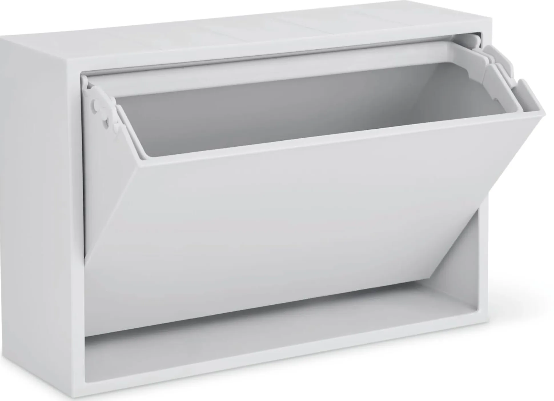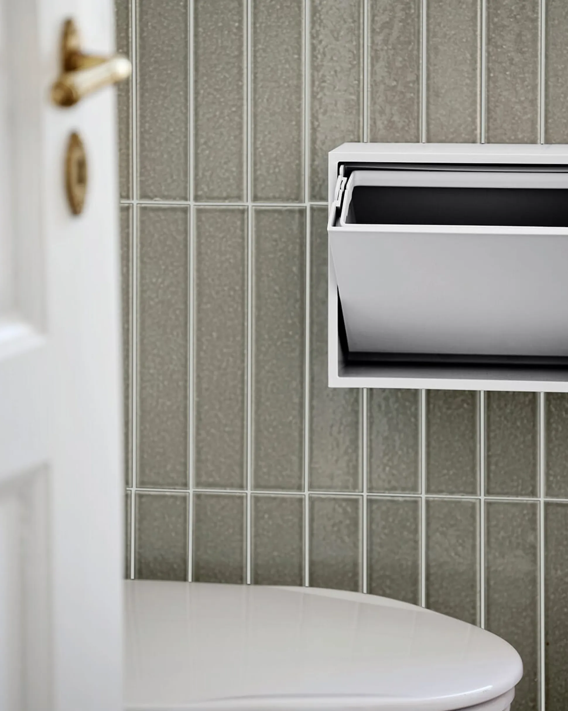 Abfallsammler – neu gedacht. ReCollector wird an der Wand montiert. Seine Handhabung ist kinderleicht: Durch leichten Druck auf die Unterseite kippt der Behälter auf und macht den Inhalt zugänglich. Der Inneneimer kann mit den beiden Tragegriffen, die auch zur Fixierung von Müllbeuteln zu nutzen sind, leicht zur Entleerung oder Reinigung entnommen werden. Einzeln, in Reihe oder übereinander montierbar. Der ReCollector ist zu 100 % aus recyceltem Polypropylen in Dänemark hergestellt.