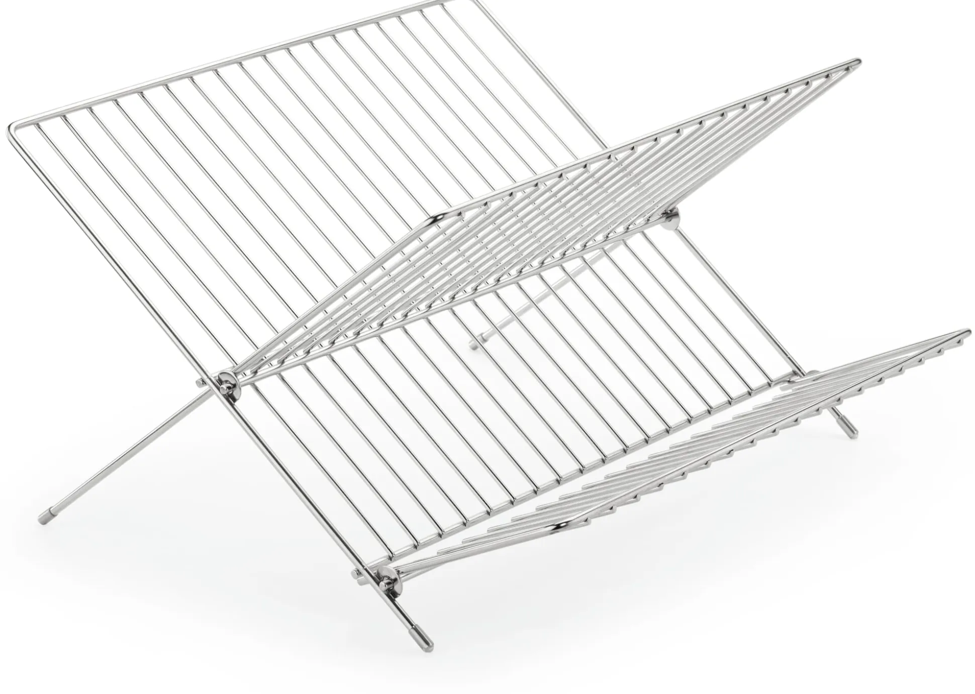 Edelstahl 18/8. Hergestellt in Italien. Aufgestellt H 22 × B 29/40 × T 38 cm, zusammengeklappt H 2 × L 38 × B 38 cm. Gewicht 1,2 kg.