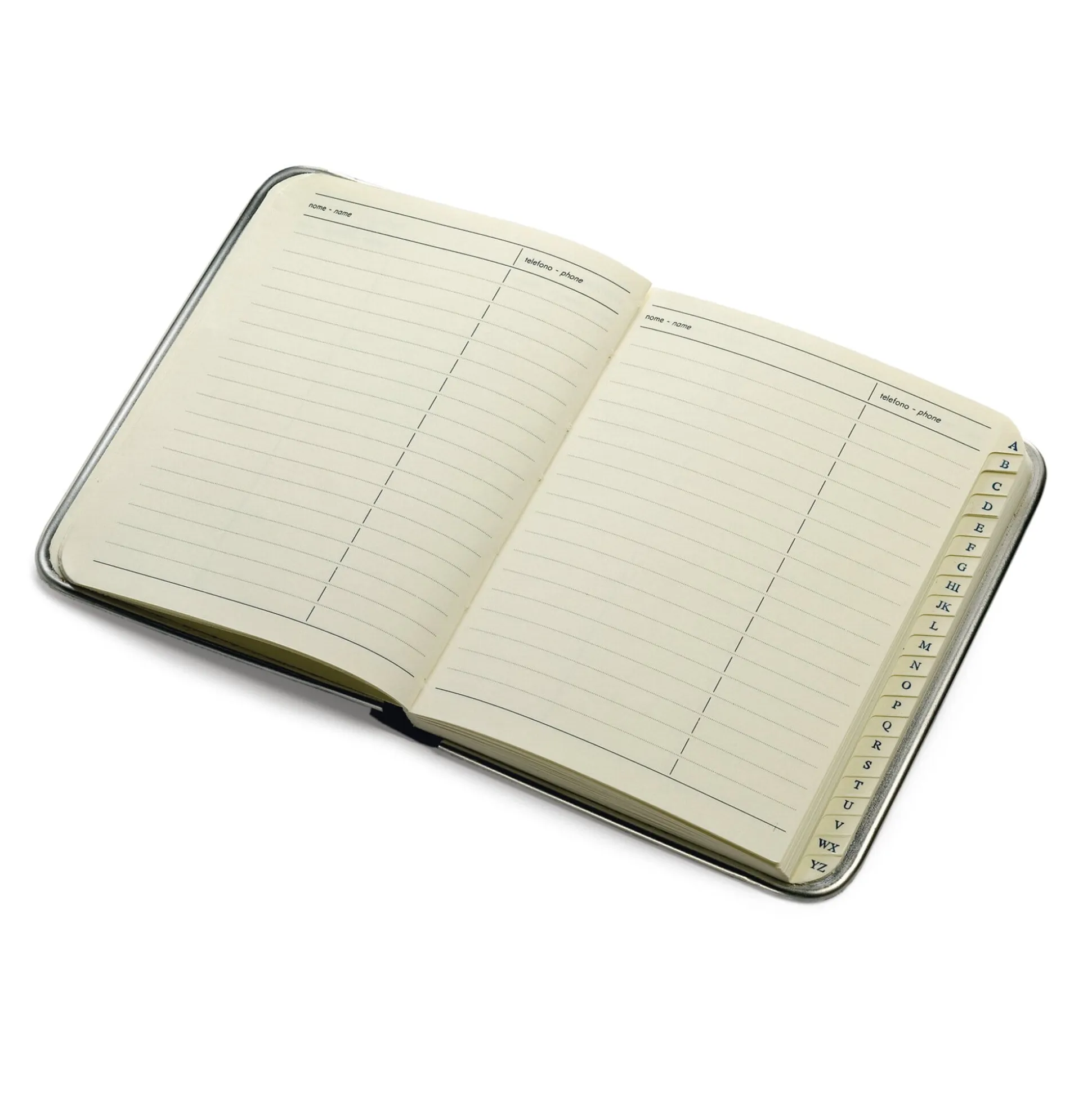 Dass der natürliche Lebensraum dieser am Chiemsee handgefertigten Adressbücher der Rucksack oder gar die Expeditionskiste ist, sieht man schon an der ungewöhnlichen Randverstärkung aus vernickeltem Blech: Der an den Ecken abgerundete Einband aus 2-mm-Texon ist so gegen Stoß und Stauchung gefeit.