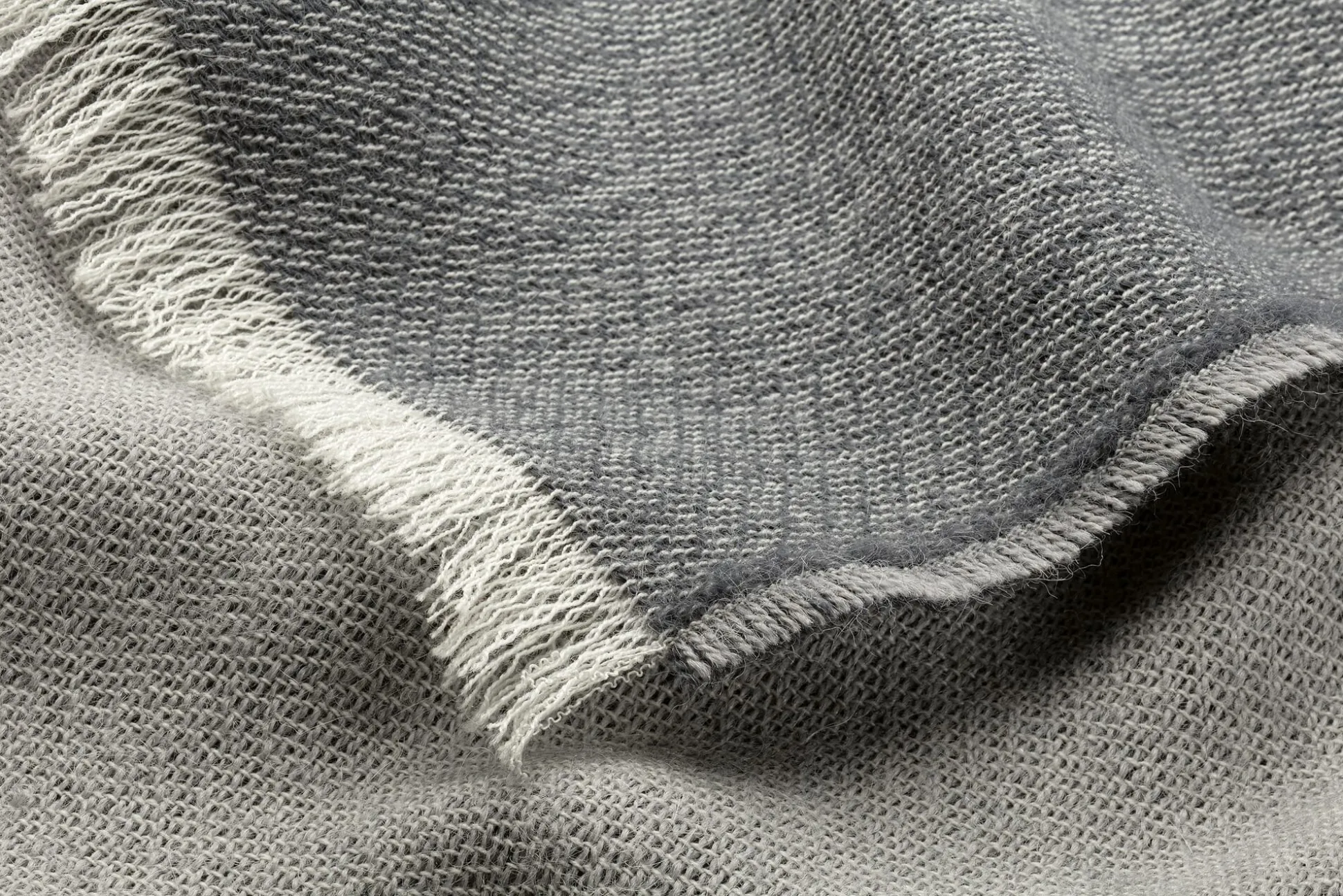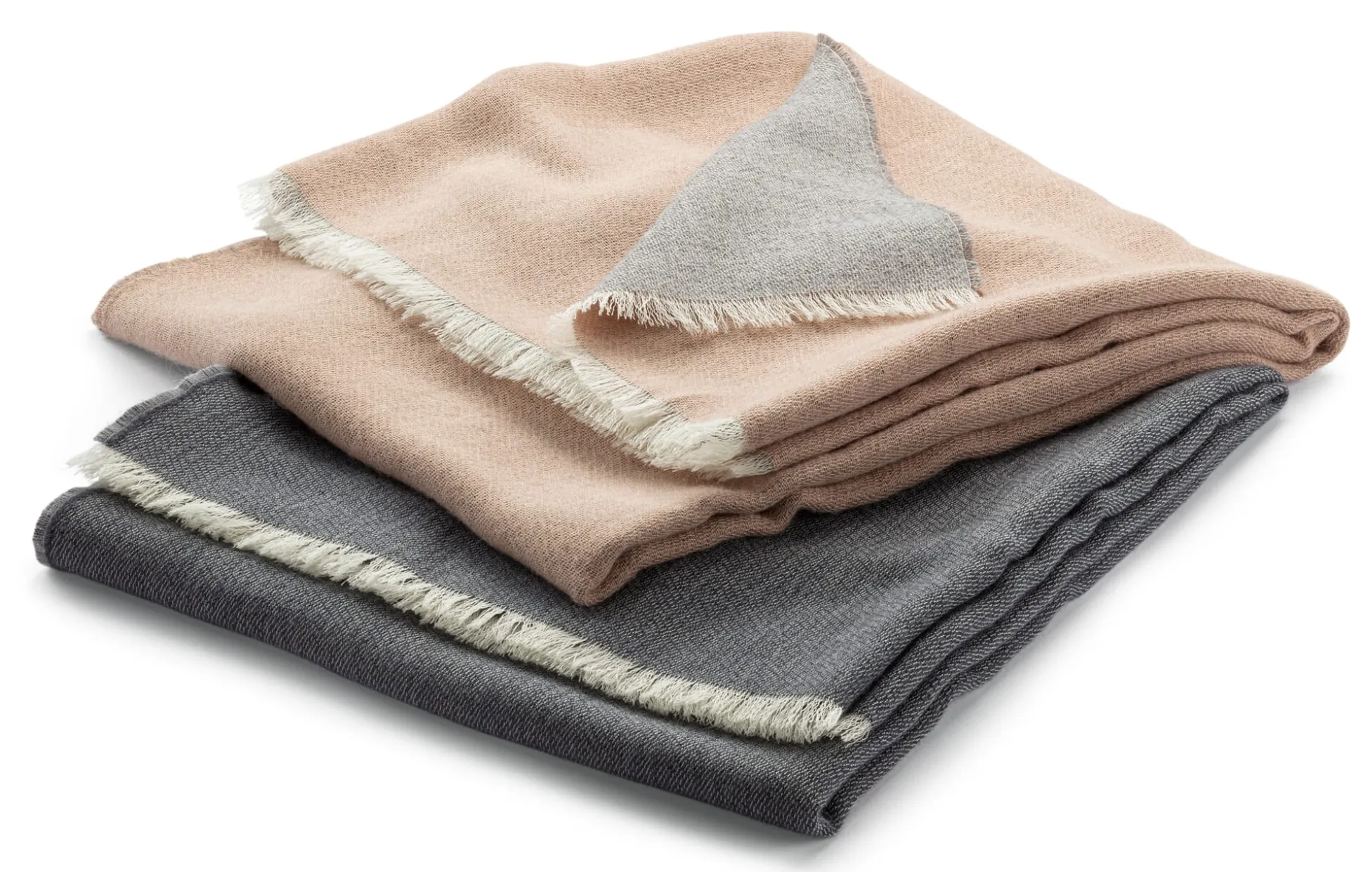 Das Gewebe der Alpakadecke ist ganz leicht strukturiert, ihre Kanten sind nicht eingefasst, sondern rundum mit sogenannten Eyelash-Fransen versehen, die an der Schmalseite etwas länger sind. Sie zeigen dort die Farbe des in der Kette verwendeten naturfarbenen Garns, die Fransen der langen Seite haben die Farbe der beiden Schussgarne, bei der einen Farbvariante Grau und Rosé, bei der anderen Grau und Anthrazit.