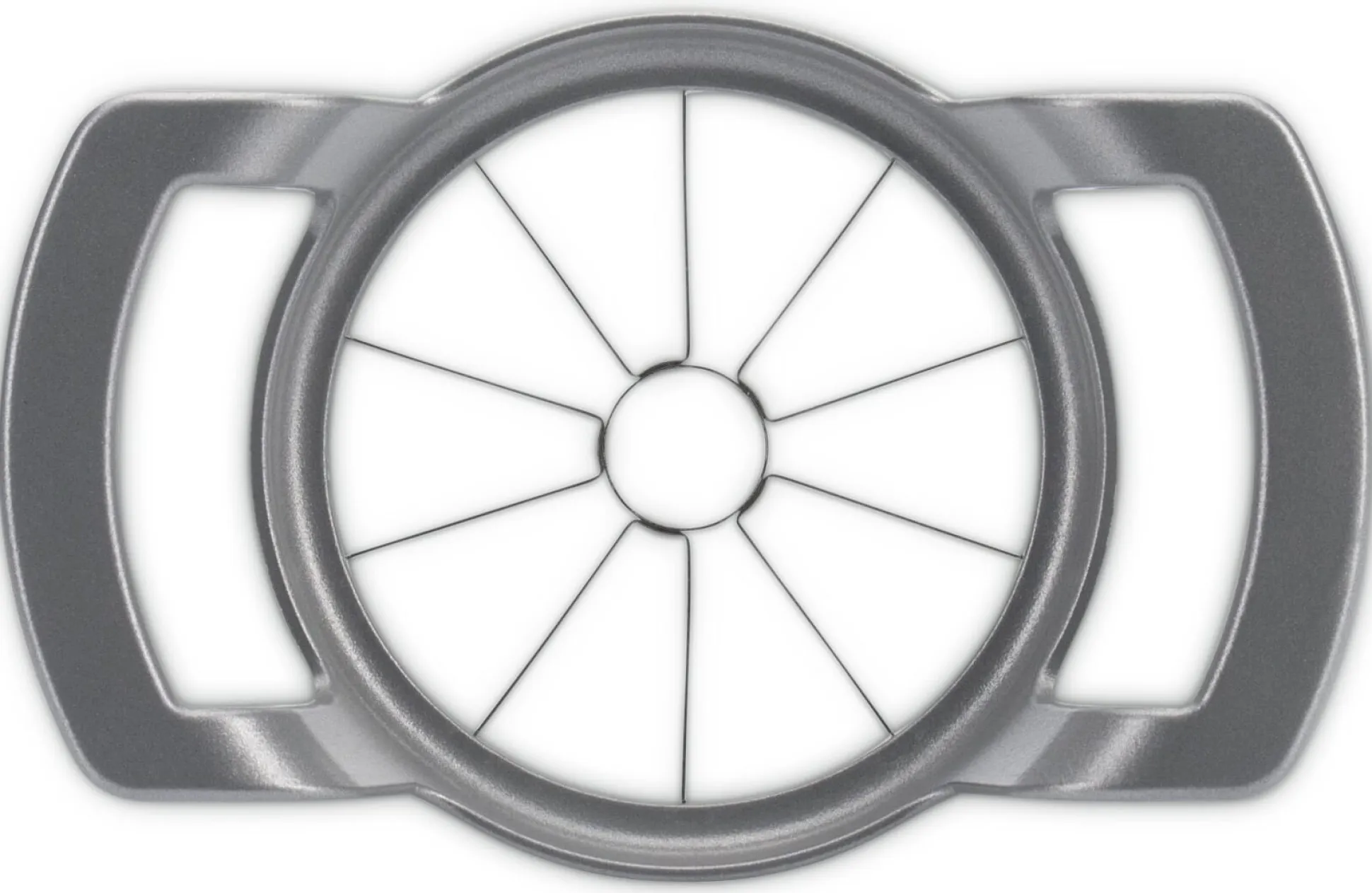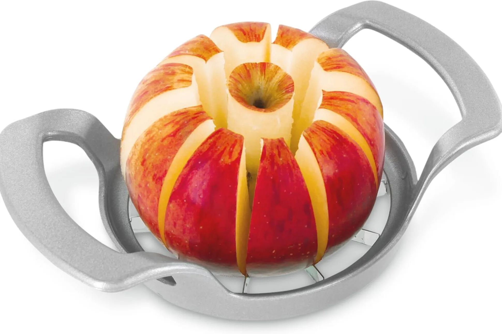 Entkernen und Schneiden. Der Apfelteiler zerteilt Äpfel (oder Birnen) in zehn gleich große Spalten und trennt dabei noch das Kerngehäuse heraus.