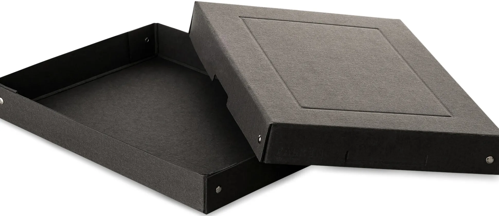 Ökonomisch und ästhetisch auf der Höhe – und in Brandenburg – gefertigt sind diese stabilen, genieteten Archivboxen aus schwarz durchgefärbter Hartpappe (Grammatur 1.200 g/qm). Die Prägung auf dem Deckel dient (ähnlich wie Sicken in Metallblechen) der Formstabilität; Eingriffe an den Längsseiten vereinfachen das Öffnen der Schachtel.