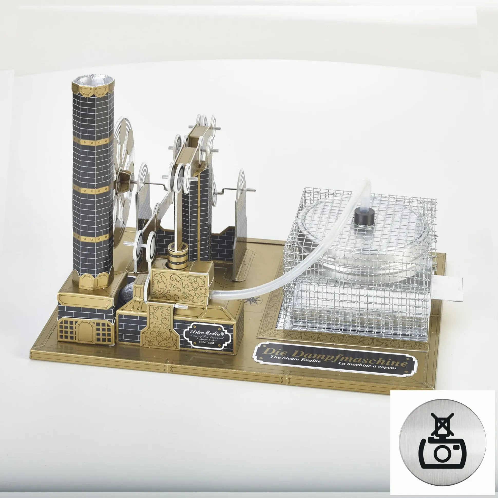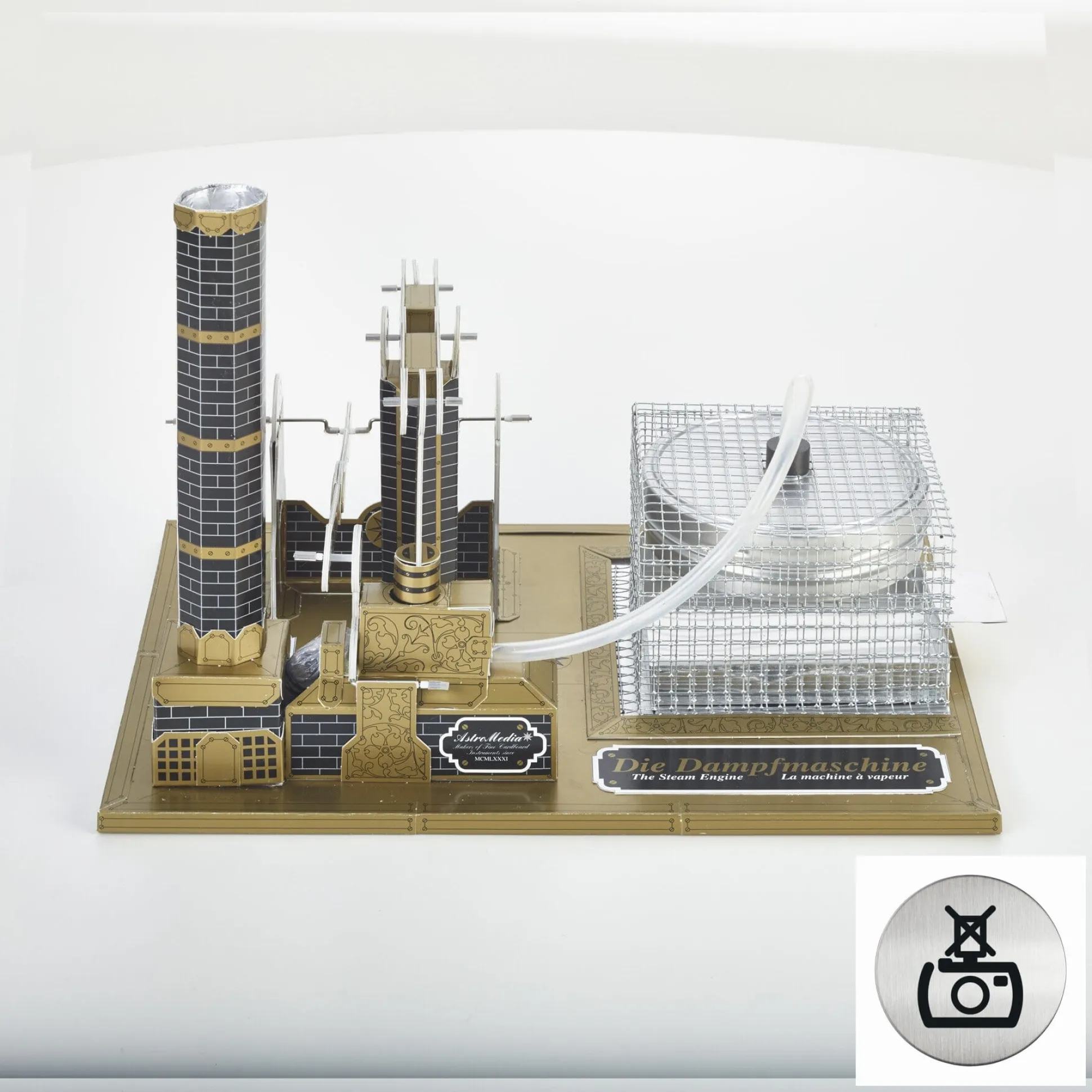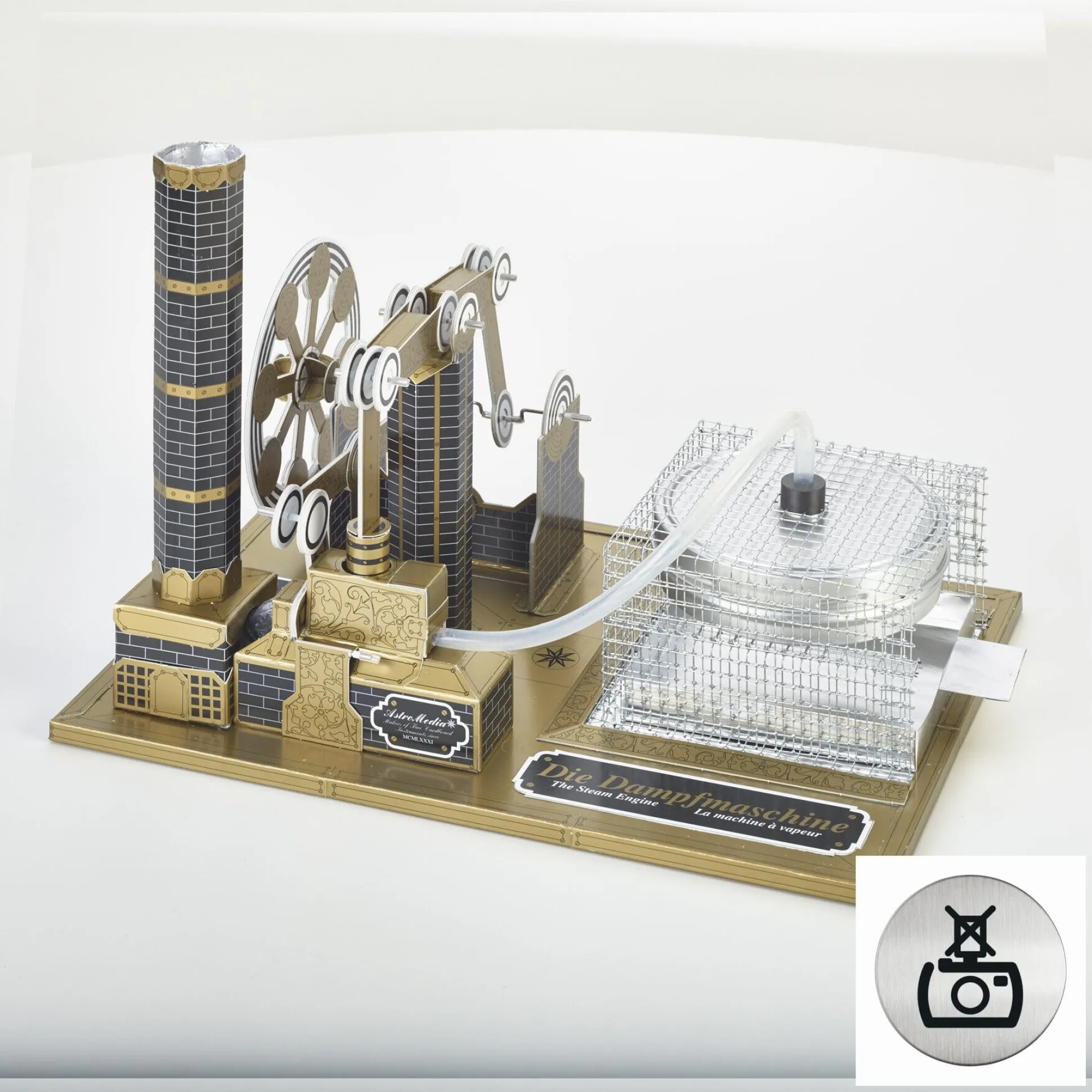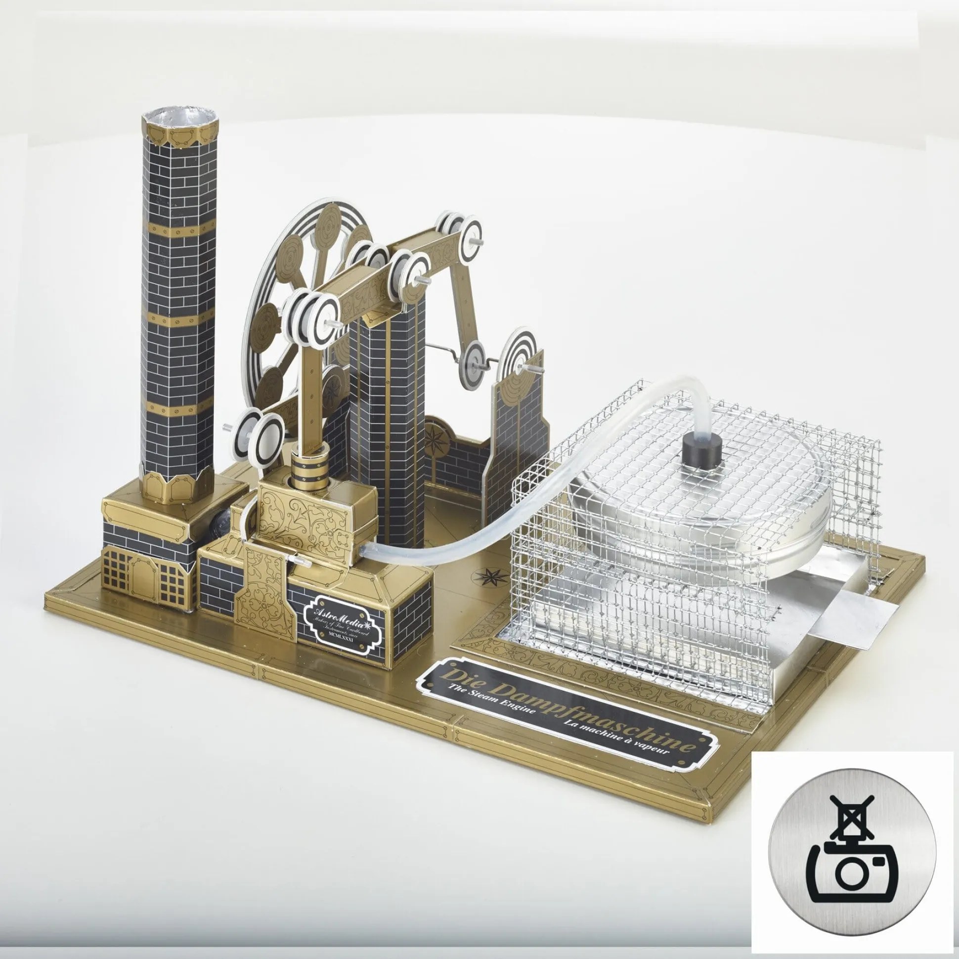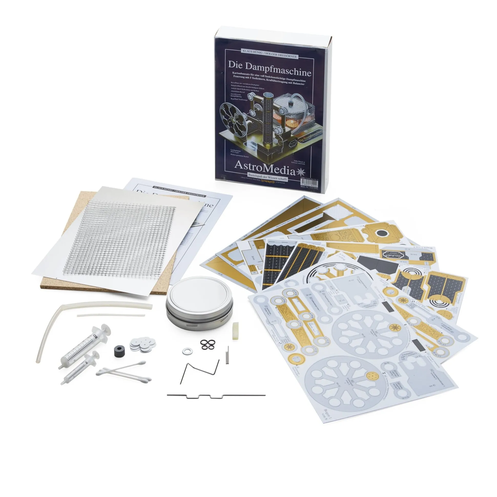 Ab 14 Jahre. Gestanzter Karton, Grundplatte aus Pressspan. Ein Dampfkessel aus Weißblech, eine Feuerschale aus Aluminium, ein Gummischlauch, ein Überdruckventil aus Aluminium, ein Kesselhaus aus Drahtgitter, eine Kunststoffspritze. Hergestellt in Deutschland.