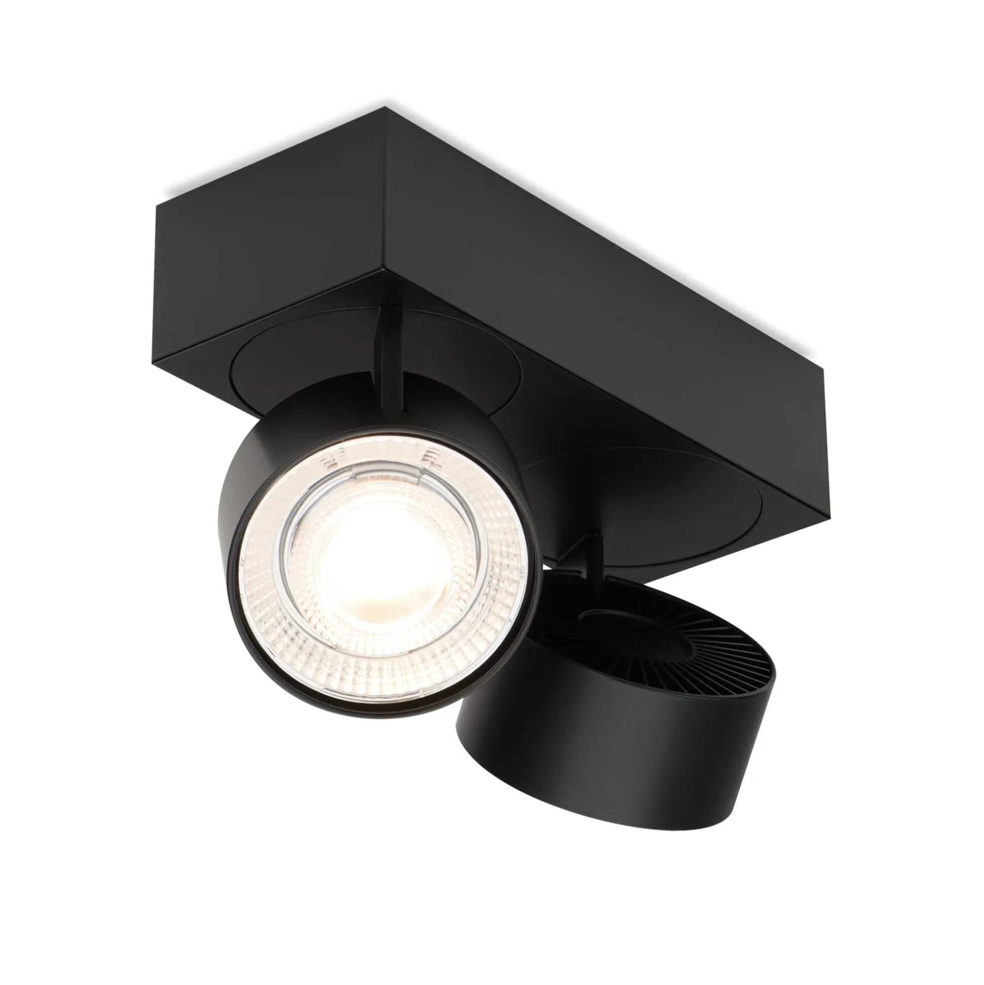 Vielseitig einsetzbarer Aufbaustrahler zur Akzentbeleuchtung. Die um 365 Grad drehbaren und 90 Grad zu schwenkenden Strahlerköpfe sitzen auf dem rechteckigen Gehäuse auf. Mit einem Griff lässt sich der gesamte Lichtkopf dank eines patentierten Bajonetts zur Wartung vom Gehäuse lösen. Aufwendiges Gehäuse, schön gefertigt, ohne sichtbare Schrauben und Kabel. Der Lichtaustrittswinkel der Leuchtmittel liegt bei 12 Grad und erzeugt damit ein punktuelles Licht. Im Lieferumfang enthalten sind zwei Aufsatzlinsen, deren Einsatz einen Lichtausfall von 38 Grad erzeugt und damit breit abstrahlt. Die Leuchte enthält LED-Lampen. Lichtstrom: 1.100 lm, Farbtemperatur: 2.700 K, Farbwiedergabe (CRI > 90), Nennleistung: 2 × 12,7 W.