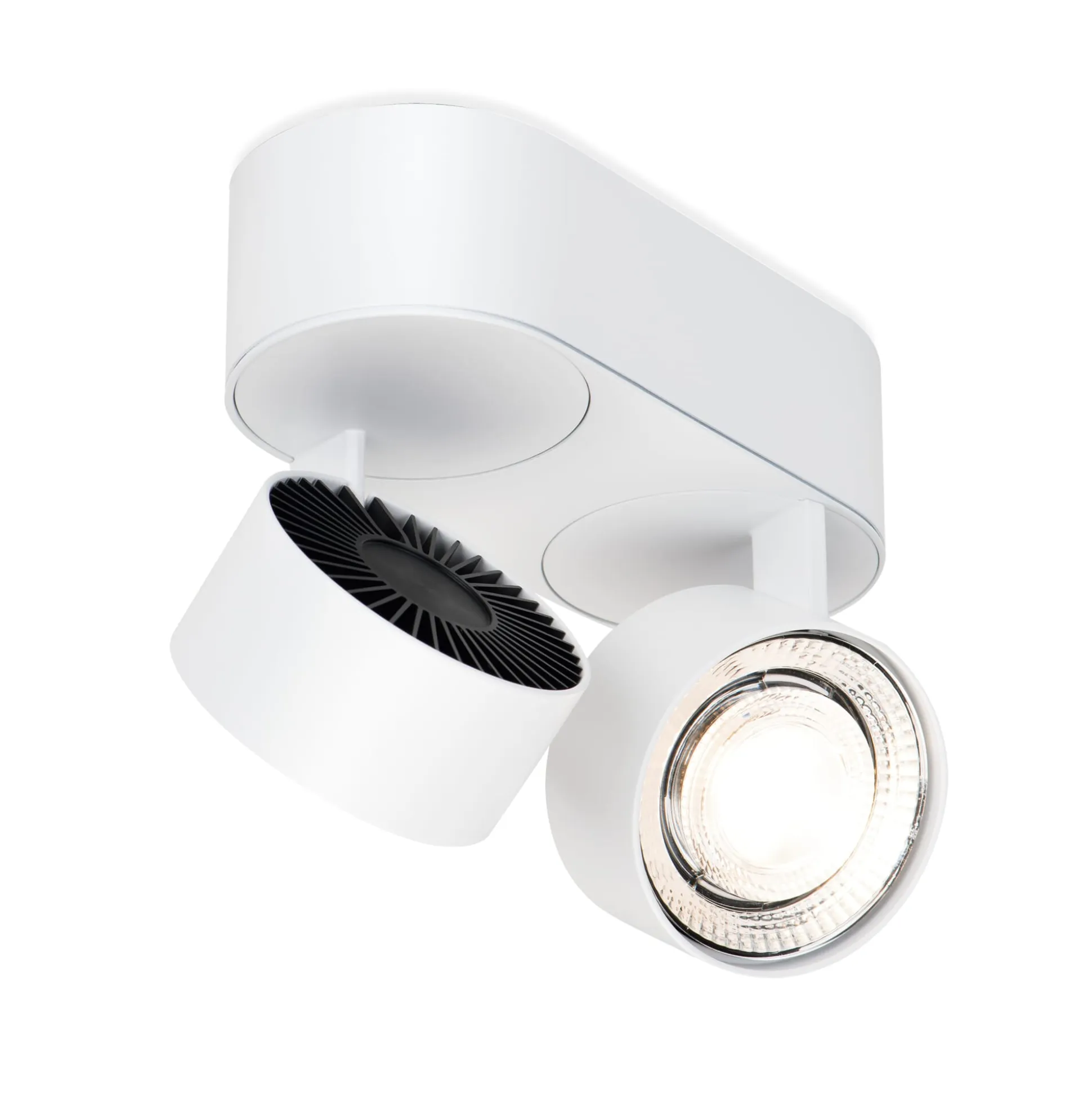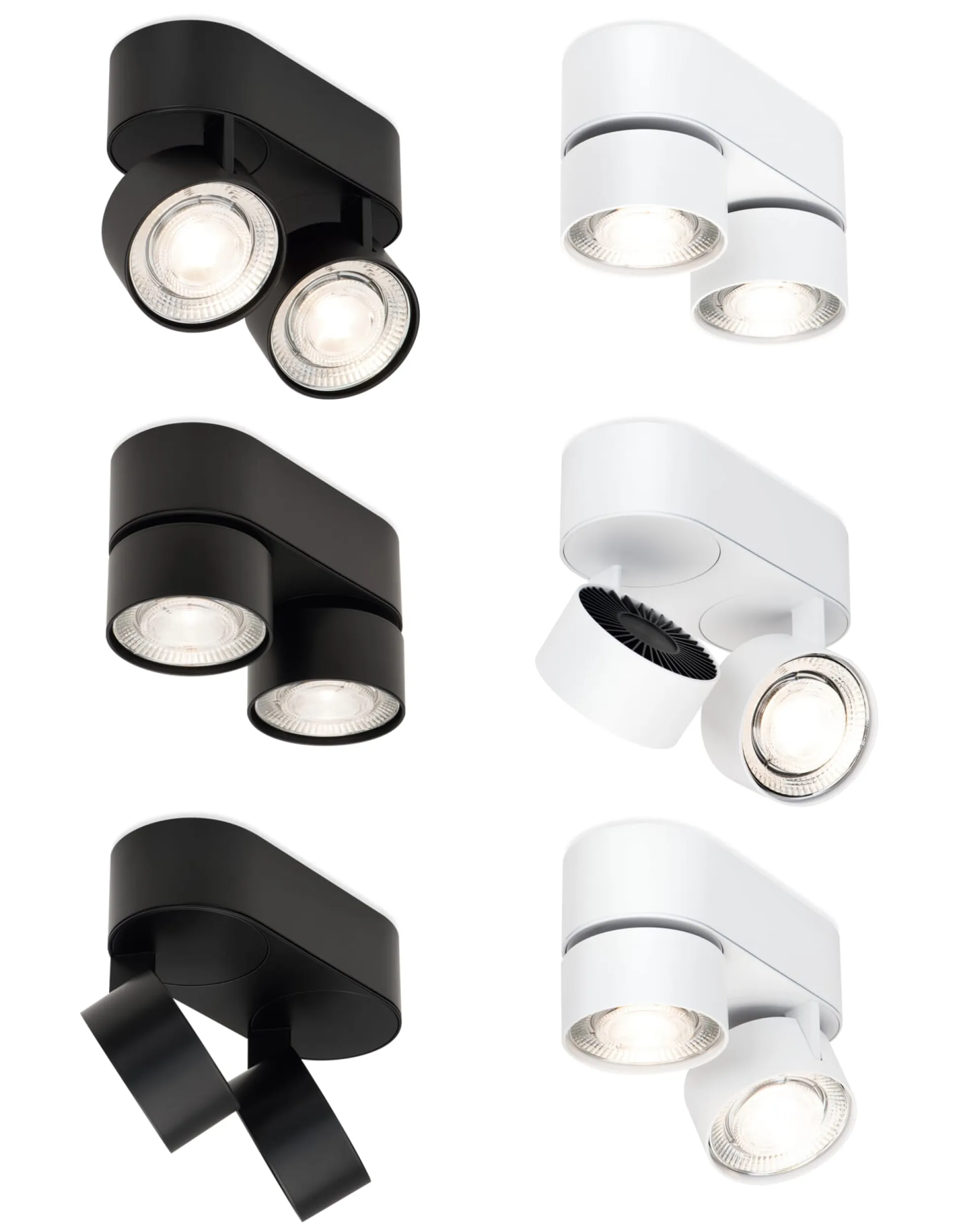 Hier in der Ausführung mit auf ein ovales Gehäuse aufgesetzten Leuchtenköpfen: vielseitig einsetzbarer Aufbaustrahler zur Akzentbeleuchtung. Die um 365 Grad drehbaren und 90 Grad zu schwenkenden Strahlerköpfe sitzen auf dem ovalen Gehäuse auf. Mit einem Griff lässt sich der gesamte Lichtkopf dank eines patentierten Bajonetts zur Wartung vom Gehäuse lösen. Aufwendiges Gehäuse, schön gefertigt, ohne sichtbare Schrauben und Kabel. Der Lichtaustrittswinkel der Leuchtmittel liegt bei 12 Grad und erzeugt damit ein punktuelles Licht. Im Lieferumfang enthalten sind zwei Aufsatzlinsen, deren Einsatz einen Lichtausfall von 38 Grad erzeugt und damit breit abstrahlt. Die Leuchte enthält LED-Lampen. Lichtstrom: 1.100 lm, Farbtemperatur: 2.700 K, Farbwiedergabe (CRI > 90), Nennleistung: 2 × 12,7 W.