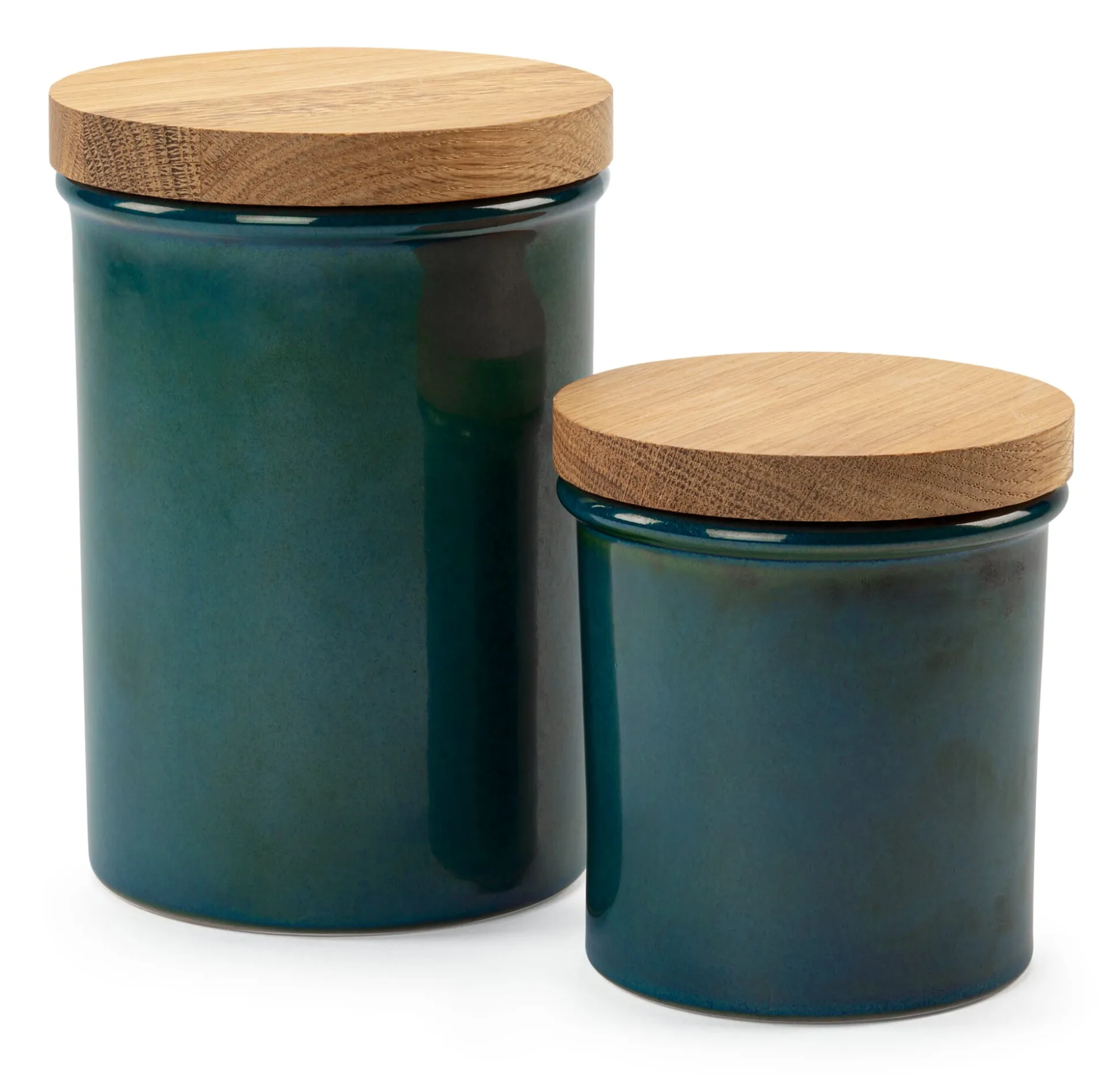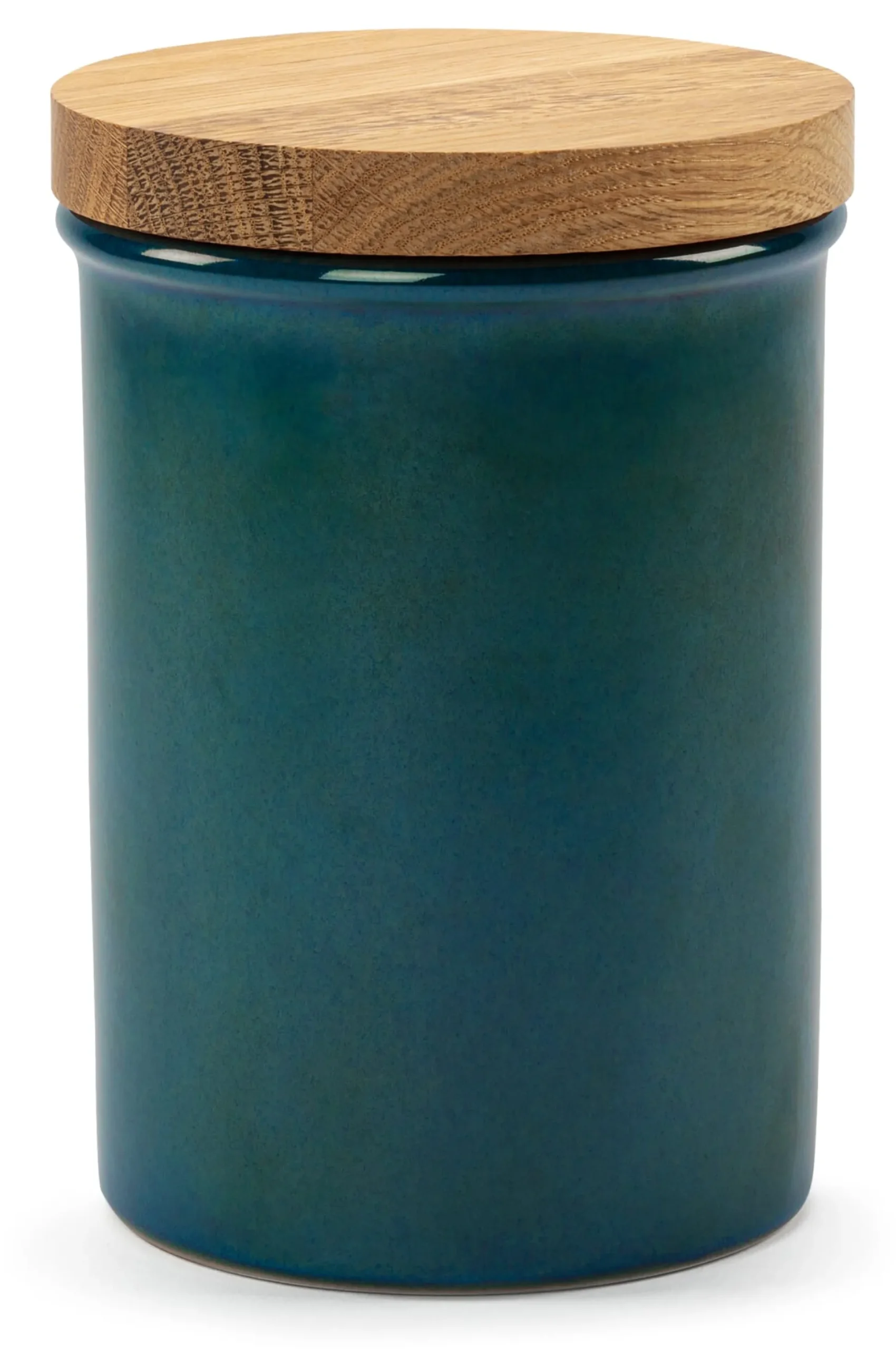 Gesinterte Keramik, grün glasiert. Deckel Eichenholz geölt, luftdicht schließend dank eines Dichtungsringes aus Naturkautschuk.