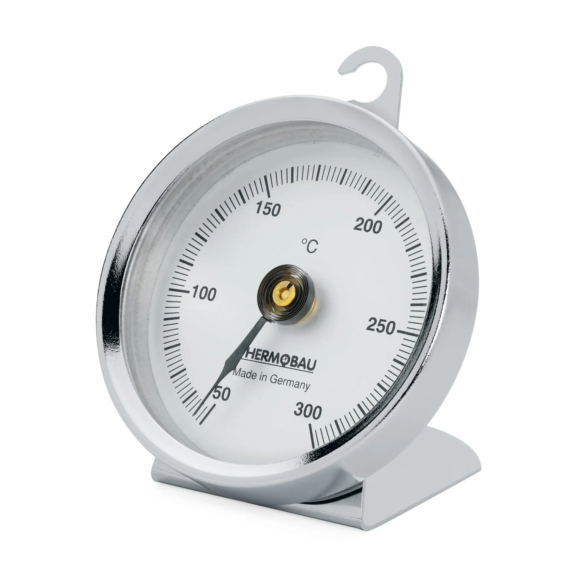 Praktisches Ofenthermometer mit gut lesbarer Skalenteilung von 50 °C bis maximal 300 °C. Gehäuse aus verchromtem Stahlblech. 6,5 cm Ø. Gewicht 75 g.