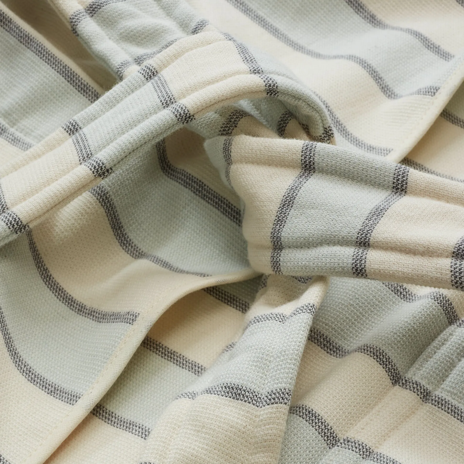 Für Familienbad und Badetag – die Textilien aus leichtem Frottier sind ganz aufeinander abgestimmt. Allen gemein ist ihre besondere Webart: Die eine Seite wird als Frottier mit der typischen Schlinge gewebt, das viel Feuchtigkeit aufnehmen kann. Die andere Seite ist glatt und weich. Das spart Gewicht (Flächengewicht 330 g/qm) und Volumen, ohne dass die Tücher dabei an Saugkraft verlieren, sie sind daher ideal für Reise, Strand und Schwimmbad. Hergestellt werden die leichten Frottierwaren aus kontrolliert biologisch angebauter Baumwolle.