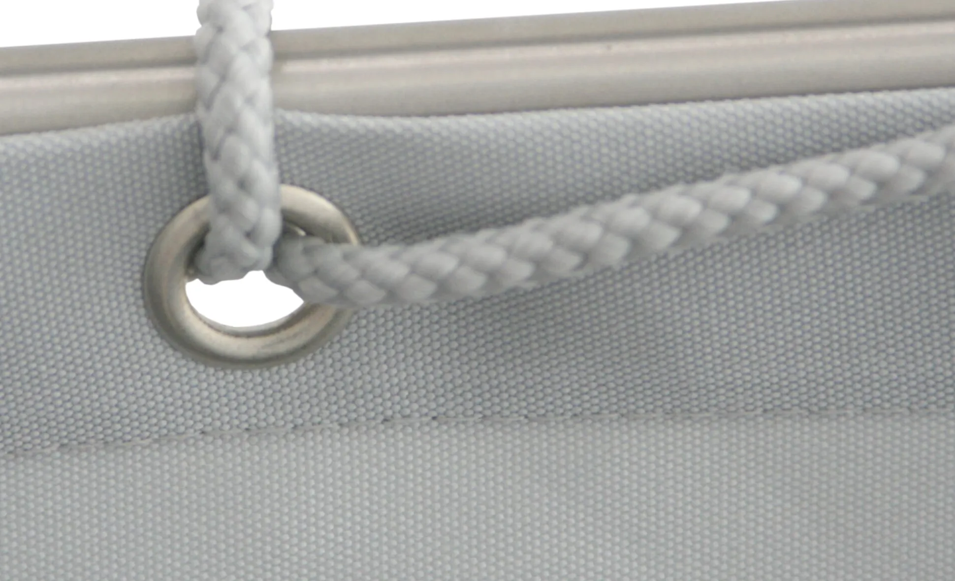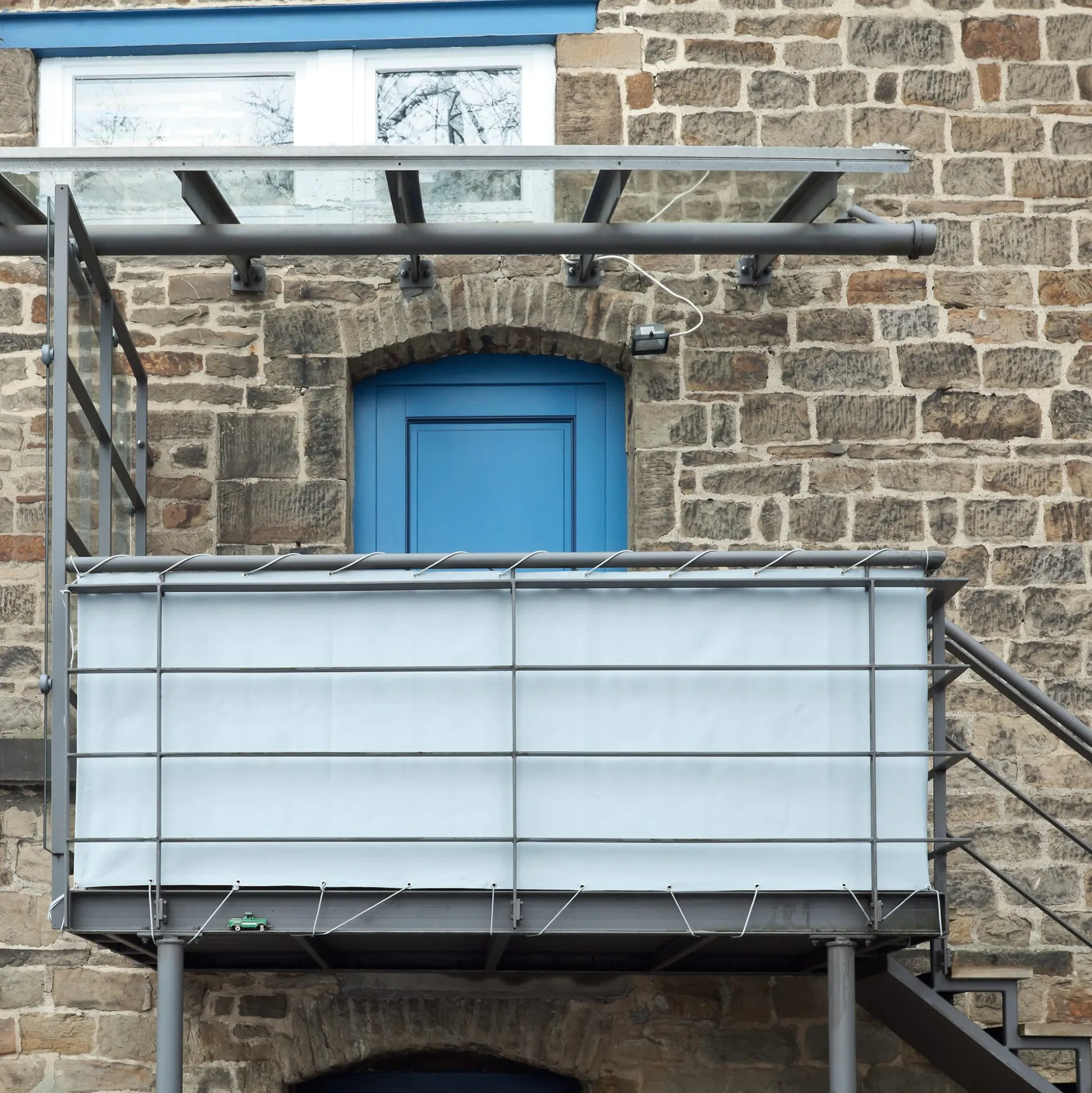 Sicht-, Wind- und Sonnenschutz: Steingraue Stoffbahn aus schwerem Textil, speziell für Balkonumrandungen gewebt. Das einem Markisenstoff ähnliche Material besteht aus wetterfestem, UV-stabilem Polyestergewebe, ist mit einer schmutz- und wasserabweisenden Antihaftbeschichtung versehen.