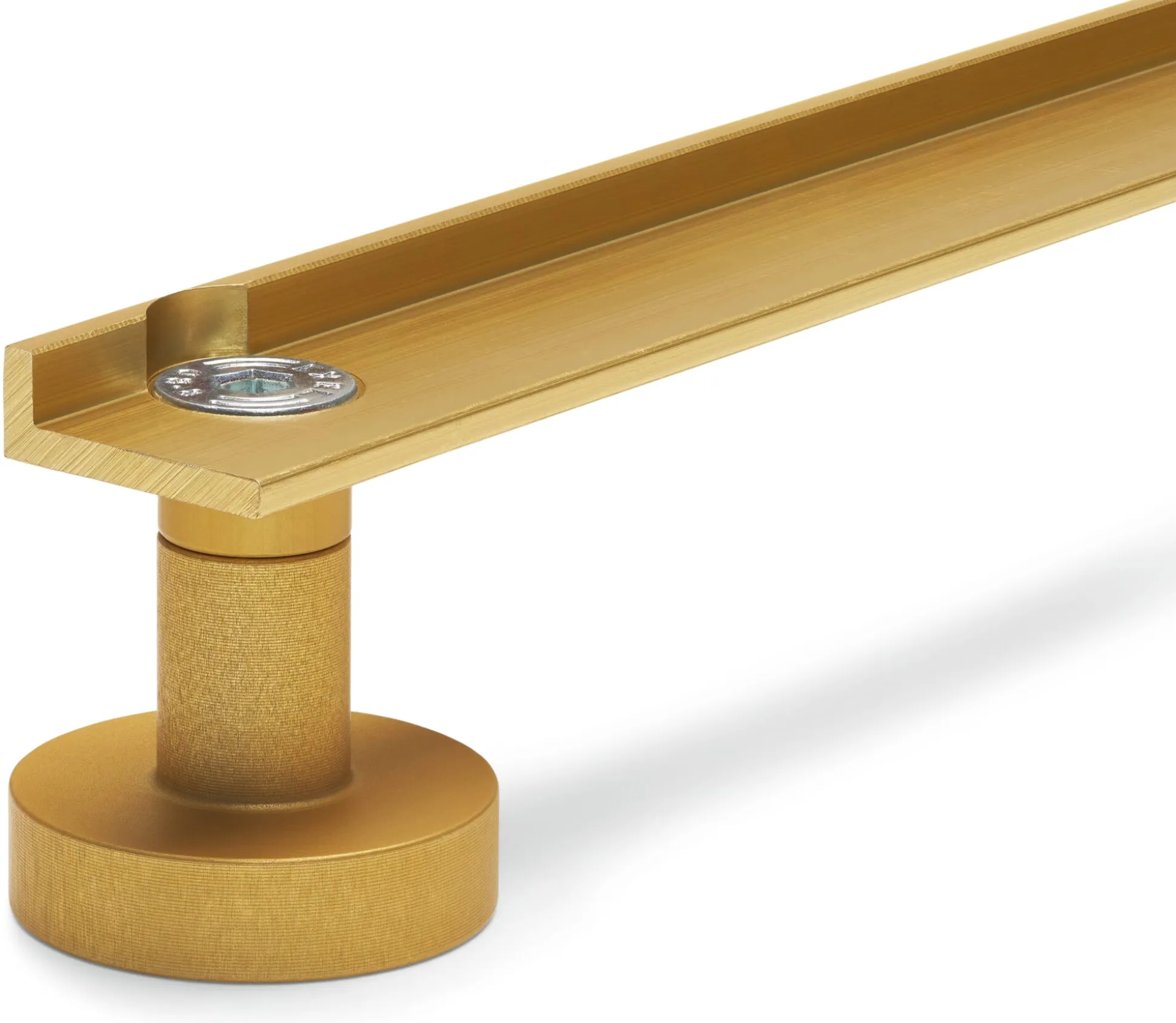 Perfekte technische Konstruktion als Ergänzung zu 1Hoch3 – in goldfarbig eloxierter Edition. Die aus zwei Stellfüßen bestehende Einheit fügt sich mit ihrer verbindenden Aluminiumschiene in die Schiene der Regalbauplatte. Der den Regalaufbau vereinfachende Ausgleich unebener Böden ist damit möglich. Eine gute Lösung, die den Zweiklang der Materialien Aluminium und Schichtholz noch unterstreicht.