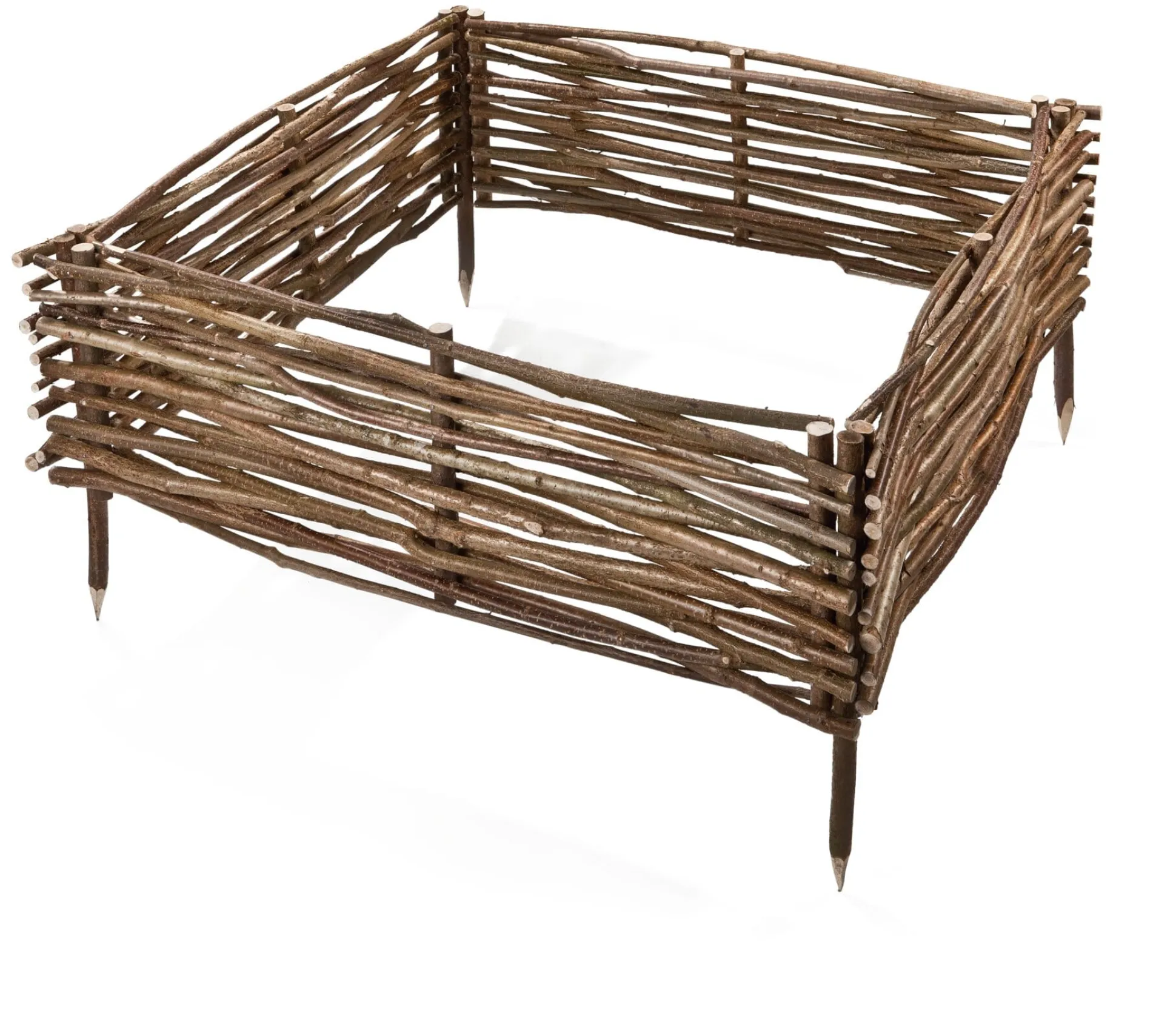 Vier Seitenelemente aus Haselruten und vier Pfosten aus Haselnussholz, PE-Folie, zum Bau einer quadratischen Beetumrandung. Lieferung mit Befestigungsmaterial, ohne Inhalt.
