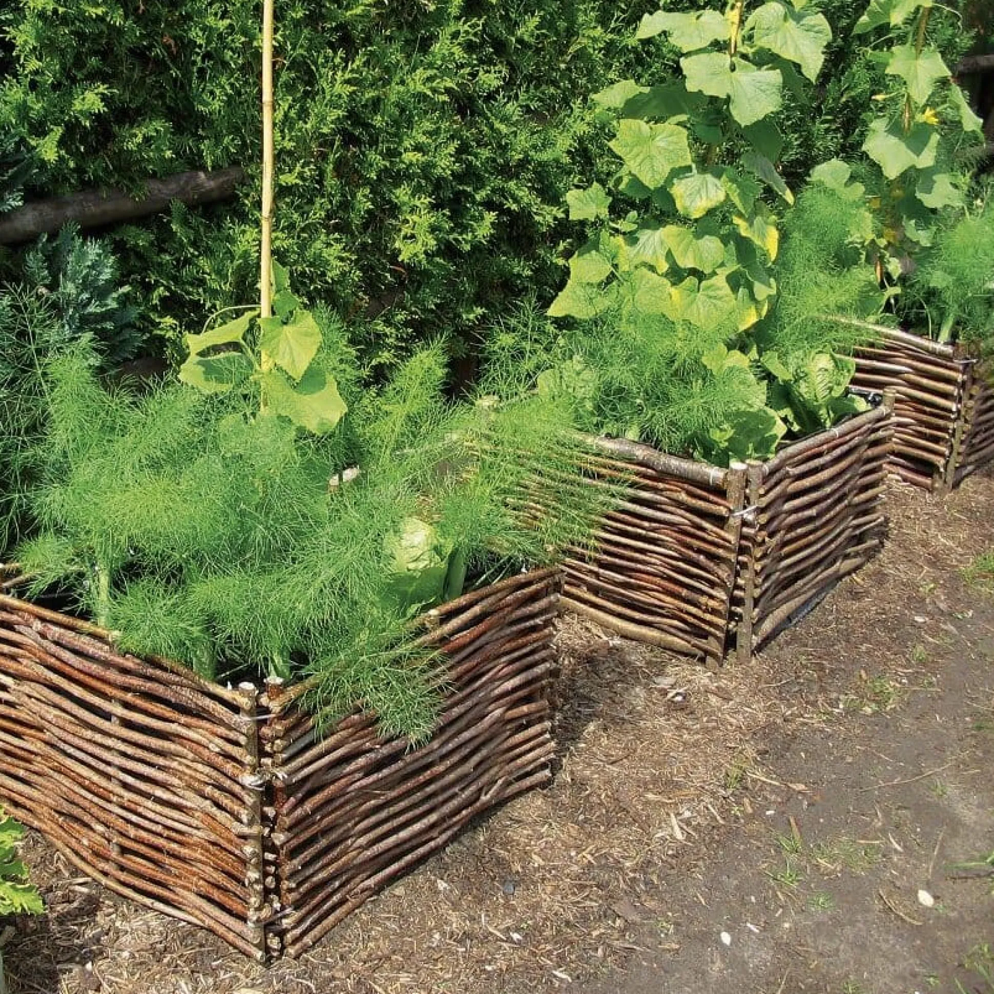 Die Tradition, Beete – meist kleinere, quadratische – mit Umzäunungen aus geflochtenen Haselruten zu versehen, ist Jahrhunderte alt. In mittelalterlichen Bauern- und Klostergärten setzte man sie beispielsweise dazu ein, Apotheken- von Küchenkräutern zu trennen, um ein Vermischen der Bestände zu verhindern. Zudem sind in den etwas erhöhten und übersichtlichen Beetflächen Unkraut, Schädlinge und Krankheiten besser in Schach zu halten. In heutiger Zeit können die Umzäunungen noch einen ganz anderen Zweck erfüllen: Mit ihrer Hilfe lassen sich in jedem städtischen Hinterhof, vollkommen unabhängig von der Güte des Bodens, kleine Kräutergärten anlegen. Dazu wird der Rahmen einfach auf den Untergrund – auch auf Beton- oder Schotterflächen beispielsweise – gestellt (zu diesem Zweck müssen die Pfosten gekürzt werden), mit der beiliegenden Folie ausgekleidet und mit guter Erde befüllt. Die Maße der Flechtelemente können leicht variieren.