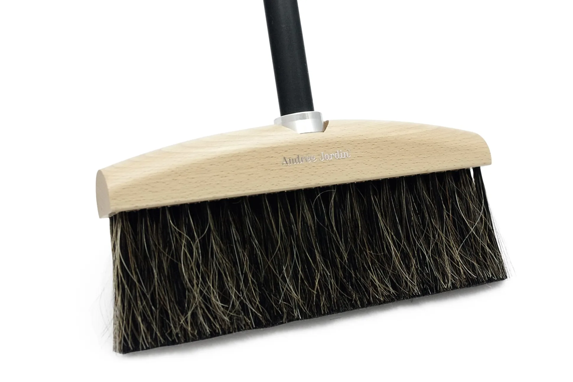 Besen mit Stiel in zeitgenössischer Gestaltung, gefertigt in den klassischen Materialien Buche und Pferdehaar bei traditionellem Hersteller in der Bretagne. Mit Stiel aus schwarz gebeiztem Buchenholz.