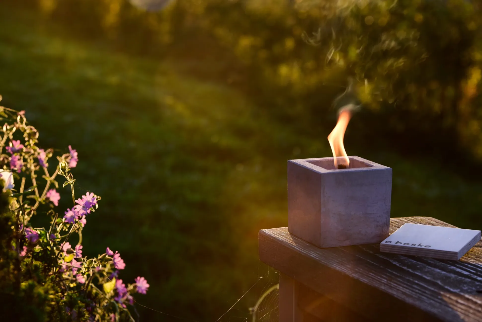 Im Garten und auf der Terrasse nimmt sich der Betonfeuer-Würfel als atmosphärische Lichtquelle aus. Die große Brennkammer und der außergewöhnlich starke Docht der Schale sorgen für eine hohe Widerstandsfähigkeit der fackelähnlichen Flamme, die selbst noch unter widrigeren Witterungsbedingungen 10 bis 15 Zentimeter hoch lodert.
