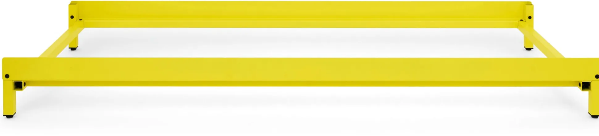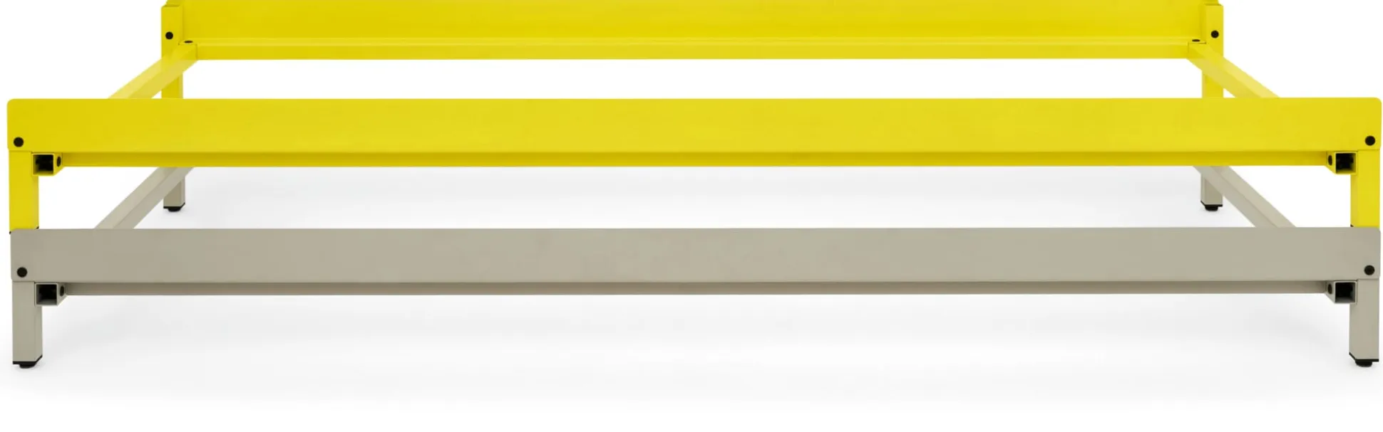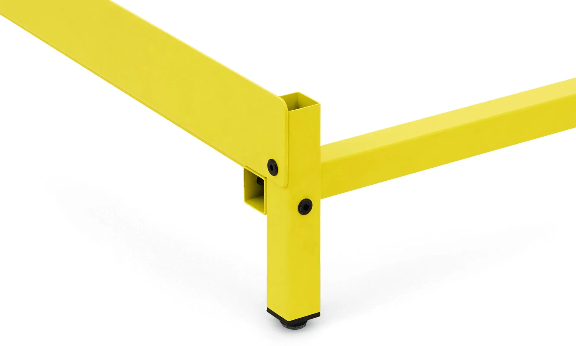 Bett ERIK ist ein im besten Sinne einfaches und äußerst stabiles Bettgestell aus sechs Vierkant-Stahlrohren und zwei gekanteten Stahlblechen, die an den Eckpunkten über Kreuz verschraubt werden. Die seitlichen Stahlbleche verhindern ein Verrutschen der Matratze. Bett ERIK ist auch stapelbar: So verwandelt es sich bei doppelter Nutzung im Handumdrehen vom gestapelten Einzelbett oder Liege spielerisch leicht zum Doppelbett. Das pragmatische Bettgestell ist für das klassische Matratzen- und Lattenrostformat 90 x 200 cm ausgelegt. Die Höhe von Lattenrost und Matratze zusammen sollte hierbei 17 cm nicht übersteigen, um die Stapelbarkeit zu gewährleisten. Leicht auf- und dank der Verschraubung auch rasch wieder abzubauen, eignet sich Bett ERIK auch für den temporären Einsatz oder den gelegentlichen Ortswechsel.