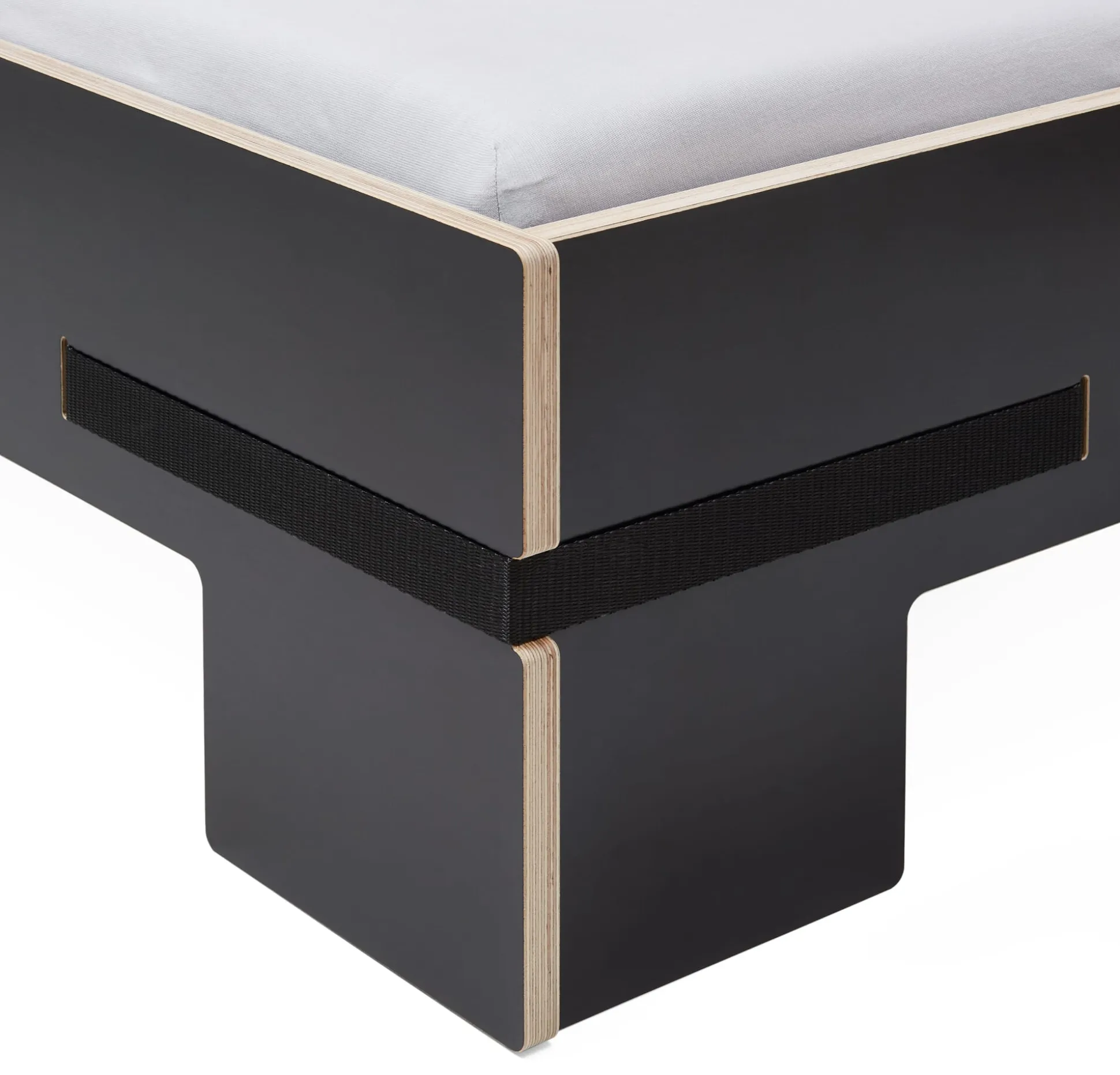 Eine Bettkonstruktion, die uns begeistert! Sie wird in doppelter Hinsicht geprägt von einem starken technischen Element, dem für die Frachtsicherung genutzten Ratschengurt. Einerseits sorgen die hinter den Ecken verborgenen Spannschlösser für exzellente Statik, andererseits kommentiert die textile Oberfläche des Gurtbandes bestens den Charakter des Möbels. Der Aufbau der sehr stabilen Konstruktion erfolgt werkzeugfrei und innerhalb weniger Minuten.