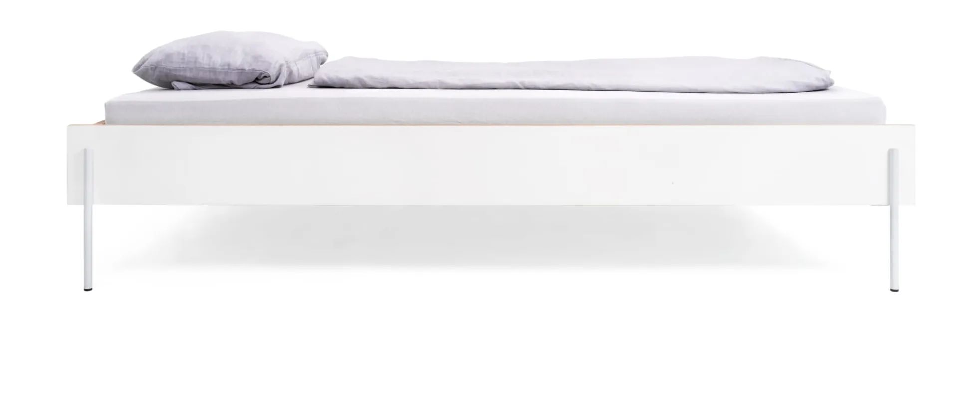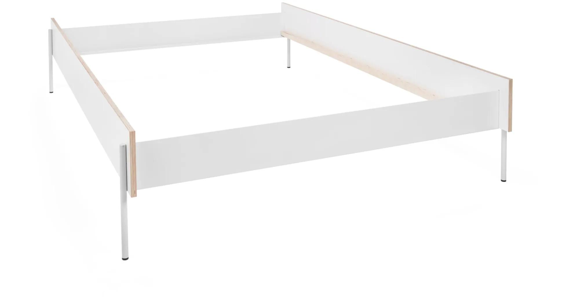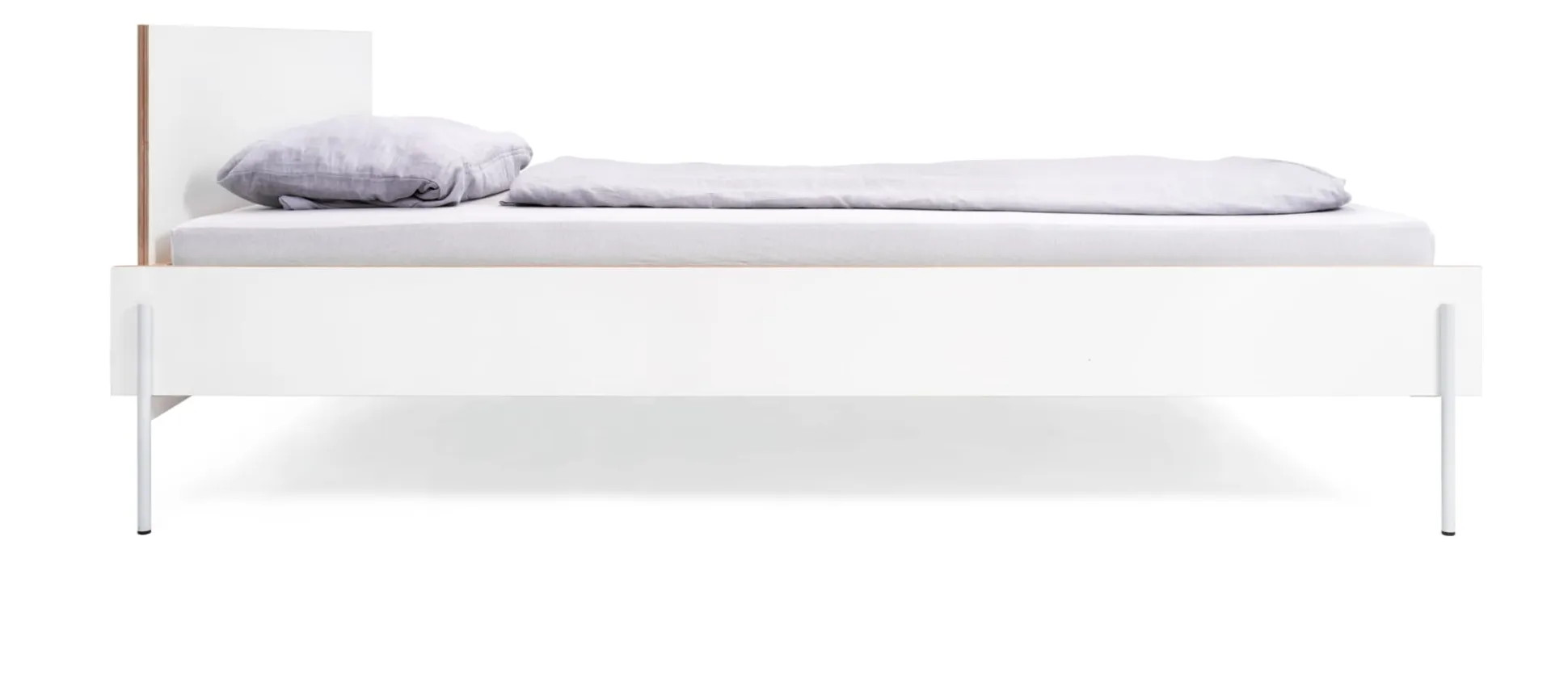 Eine formschöne und filigrane Konstruktion: Bett HANS steht auf feinen Stahlfüßen, die sich aus den stählernen Kopf- und Fußteilen entwickeln. Diese werden mit den beiden Bettseiten aus weiß beschichtetem Birkensperrholz verbunden und zu einer tragenden Einheit gebracht. Kopf- und Fußteil sowie die beiden Seiten werden durch eine Schlitzverbindung beschlagfrei zusammengesteckt. Das Zusammenspiel der beiden Materialien Stahl und Holz lässt das Bett sehr feingliedrig erscheinen, was durch die an den Kanten sichtbare Holzschichtung der Seitenteile unterstützt wird. Gleichzeitig überzeugt das Bett durch seine Stabilität und Tragfähigkeit. Der formal eigenständige Entwurf zeigt in Materialwahl und Bauweise Anklänge an typische Gestaltungsmerkmale der Ulmer Schule.