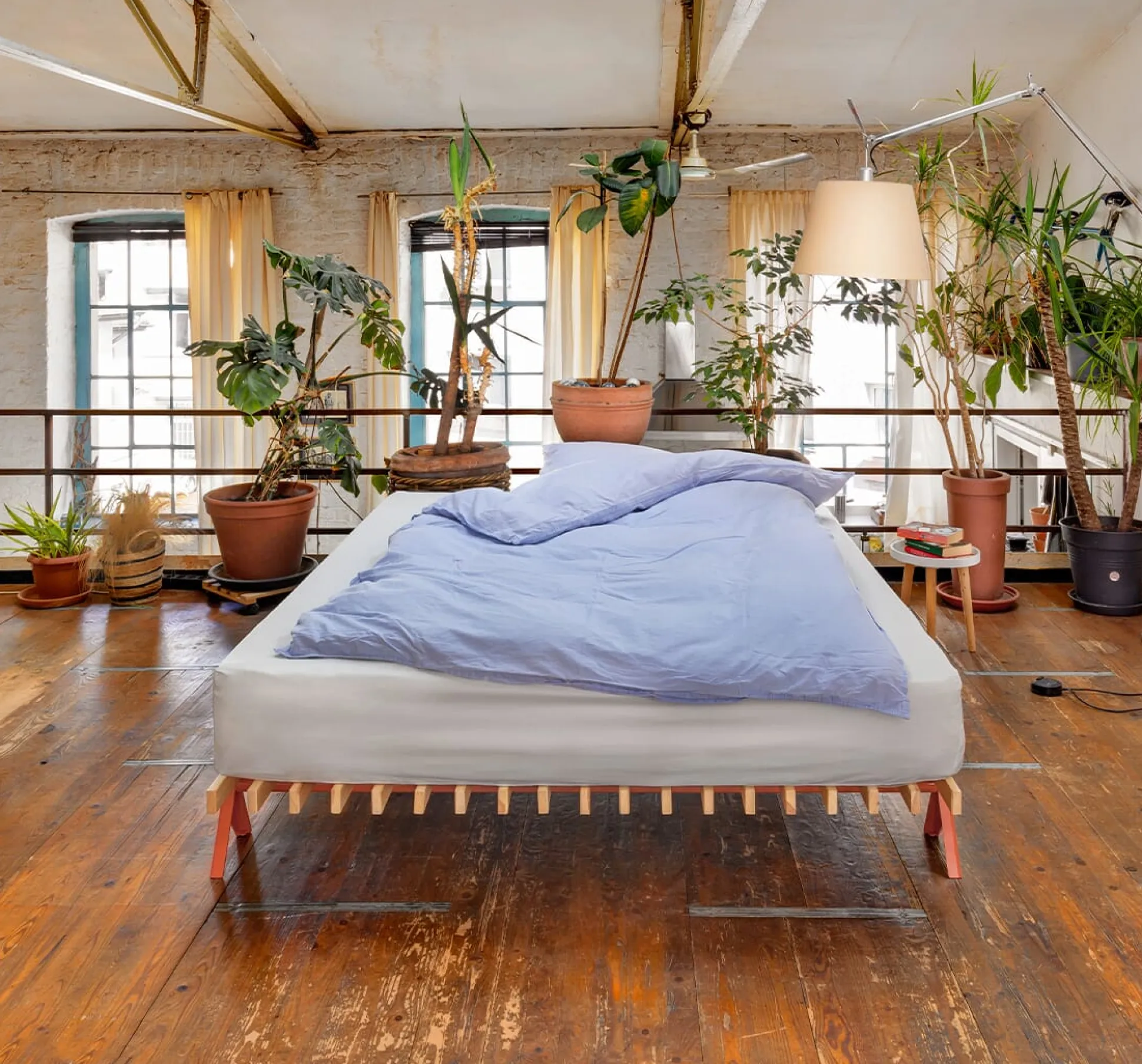 Ein schöner Effekt: Werden beim Doppelbett kleinere Matratzenbreiten verwendet, so ist die Lattenstruktur teilweise sichtbar und bedingt als Ablagefläche nutzbar. Die Länge der Latten beträgt 195 Zentimeter – Matratzen in Längen von 200 Zentimetern stehen bewusst leicht über die Enden der Holzteile hinaus.
