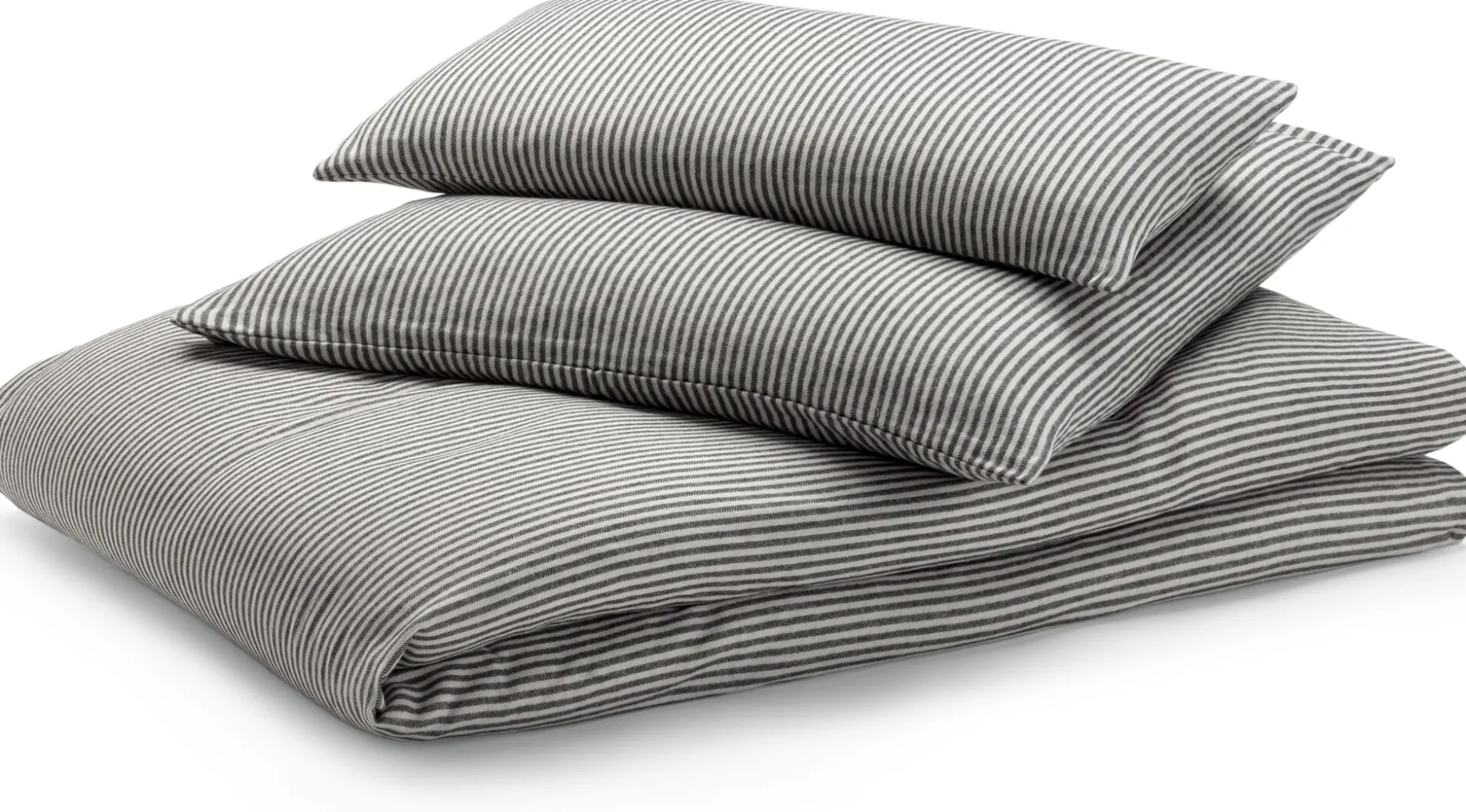 Für diesen Baumwollflanell wird feines, weiches Garn mit der Stärke Nm 27 verwendet, dadurch entsteht ein sehr dichtes und gleichmäßiges Gewebe mit weichem Griff. Mit einem Materialgewicht von 167 g/qm ist der Bauwollflanell zudem angenehm leicht. Die feinen schwarzen Streifen dieses Bettbezugs aus schmiegsamem Baumwollflanell sind übrigens eingewebt (nicht gedruckt), der Fond ist naturfarben. Geschlossen wird der Bezug mit Holzknöpfen.