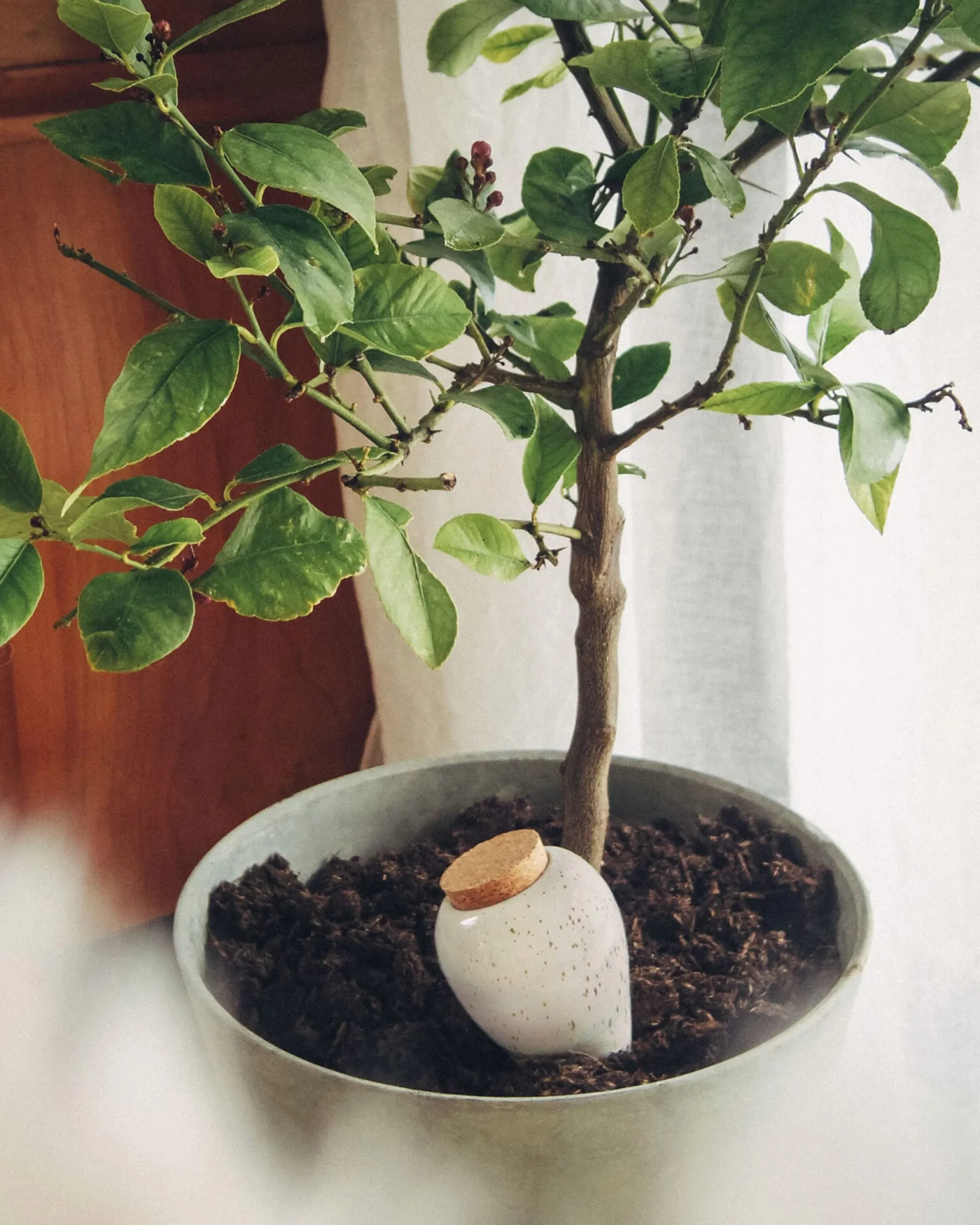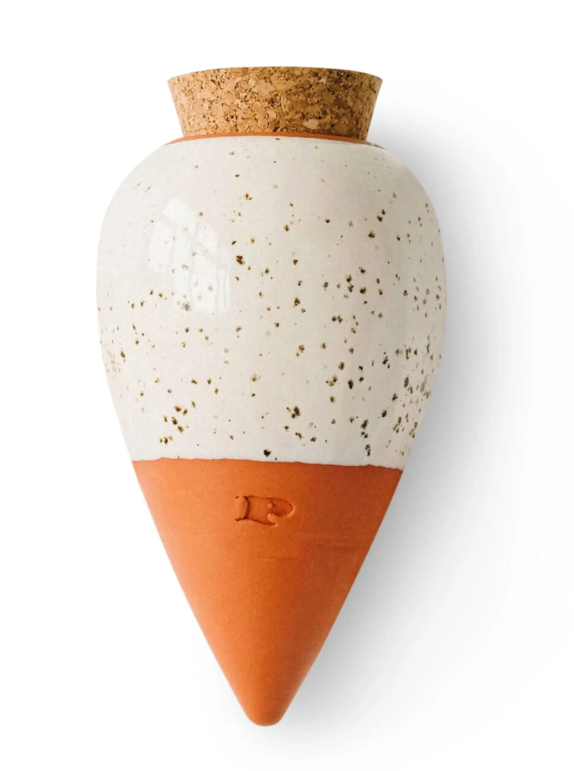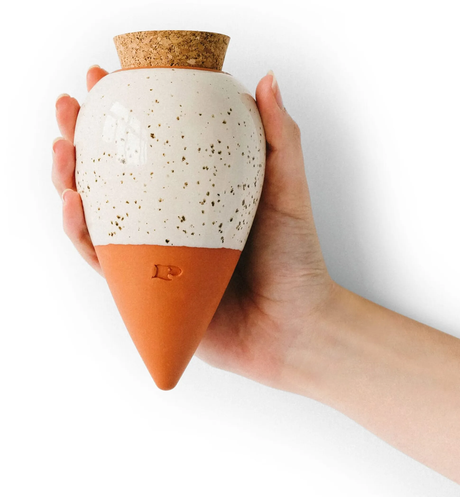 Richtig gießen leicht gemacht: Diese formschönen Bewässerungskegel werden mit dem nicht glasierten unteren Bereich in die Erde im Pflanztopf eingegraben und über die obere Öffnung mit Wasser befüllt. Der mikroporöse Ton ist so gebrannt, dass die Poren offen bleiben, das Wasser also hindurchtreten kann. Ton absorbiert und speichert Wasser auf natürliche Weise und gibt es in optimaler Menge – genau wie benötigt – an Erde und Pflanze ab. Diese gute Versorgung fördert die Wurzelentwicklung und ein gesundes Pflanzenwachstum. Überwässerung und Austrocknung werden vermieden.