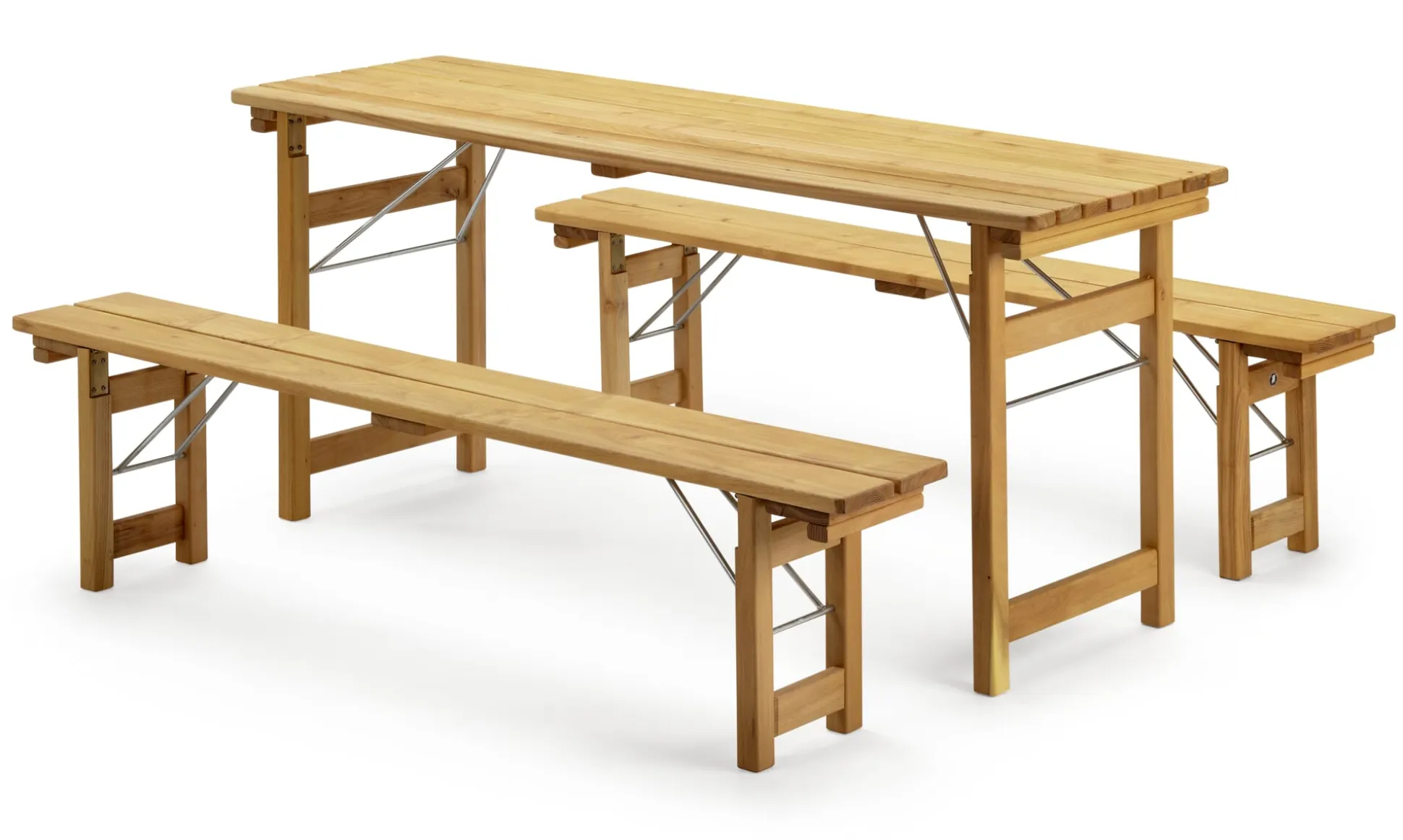 Zwei Bänke, Robinie geölt, Beschläge Stahl verzinkt. Höhe 43 cm, Länge 180 cm, Breite 25 cm. Beine 4 × 4 cm. Klappmaße 180 × 25 × 7,5 cm. Gewicht 15,5 kg.
