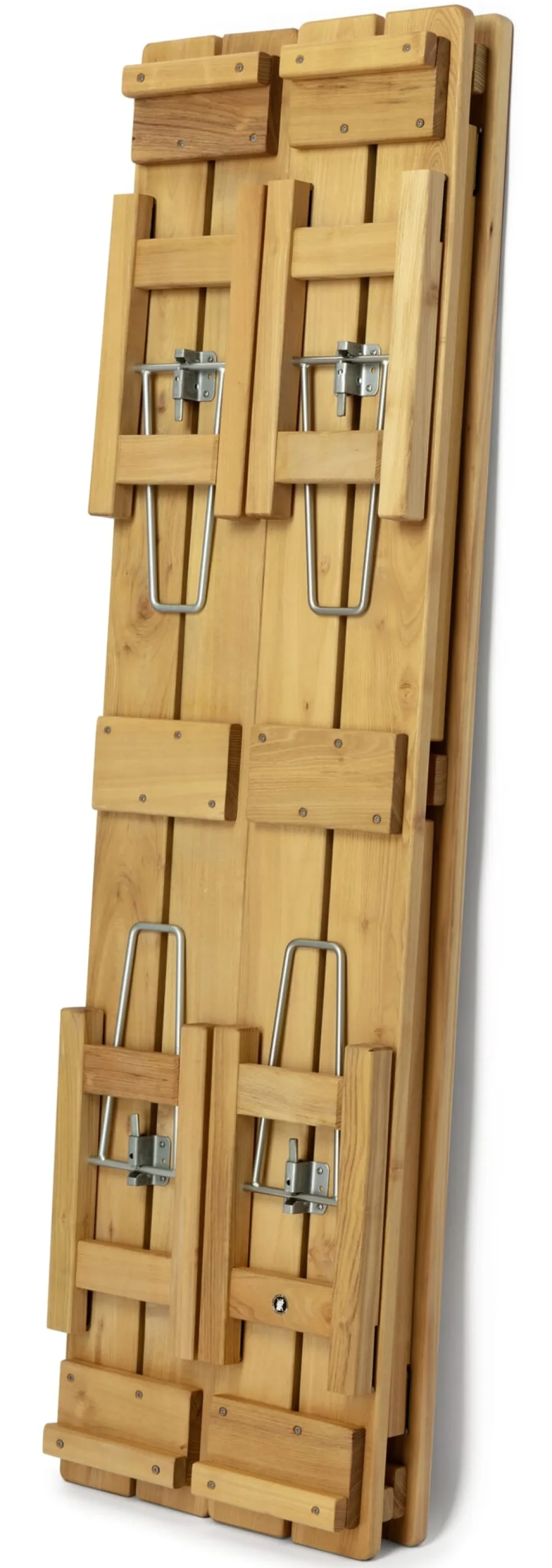 Das Besondere: Massives Robinienholz wird nicht nur bei den Latten (diese sind beachtliche 2,7 cm stark), sondern auch bei den Beinen (mit einer Kantenlänge von 4 cm) verwendet, und schwere Klappbeschläge aus verzinktem Stahl verbinden alles außerordentlich stabil miteinander. Die ganze Konstruktion übersteigt also bei weitem die gattungstypische Beschränkung auf das Notwendige.
