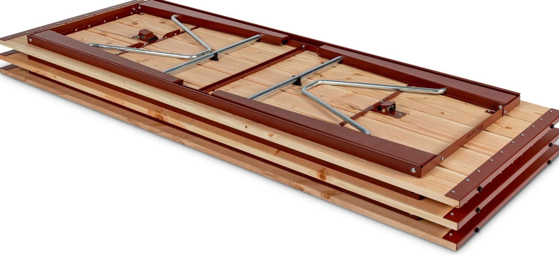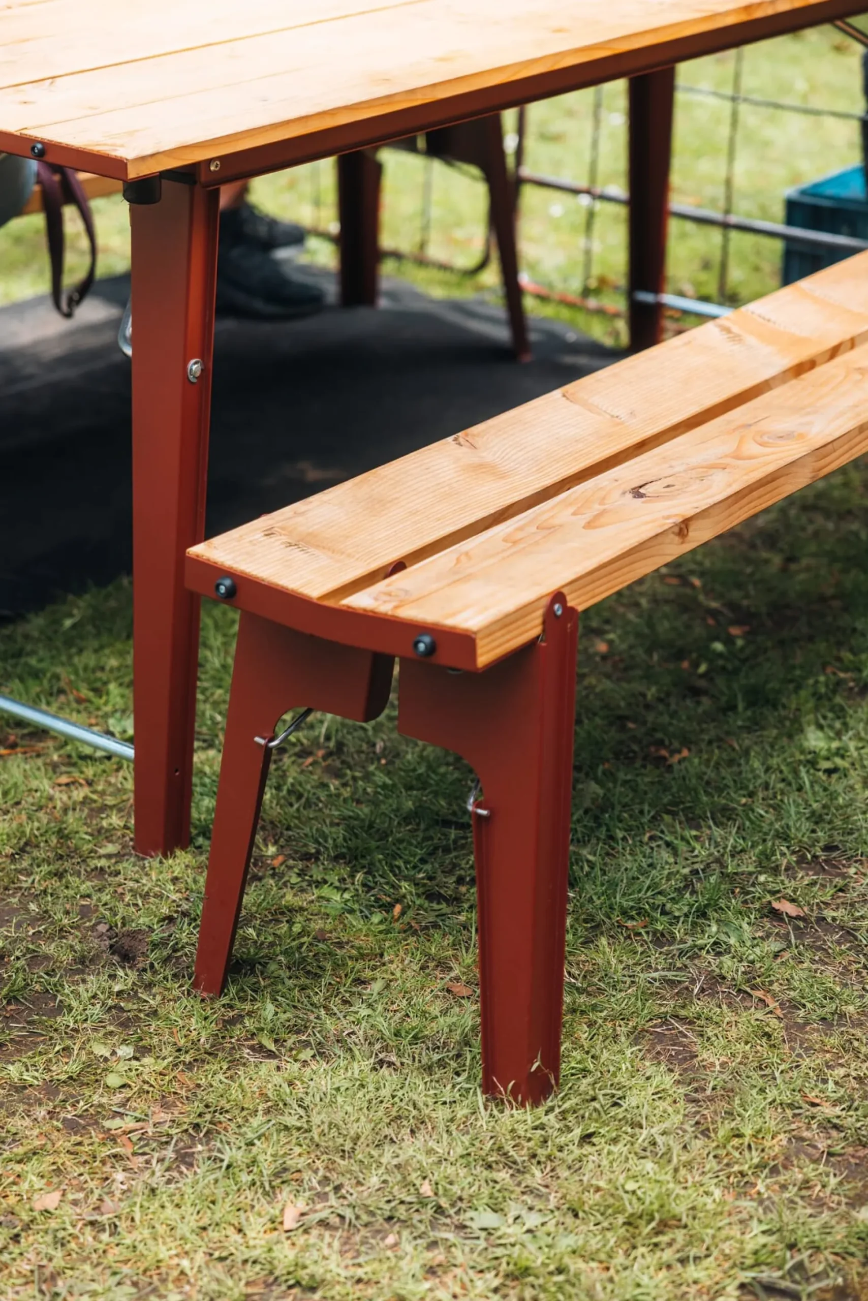 Material: Stahl, pulverbeschichtet (RAL 3009 Oxidrot); Lärche (Herkunft: Polen)
