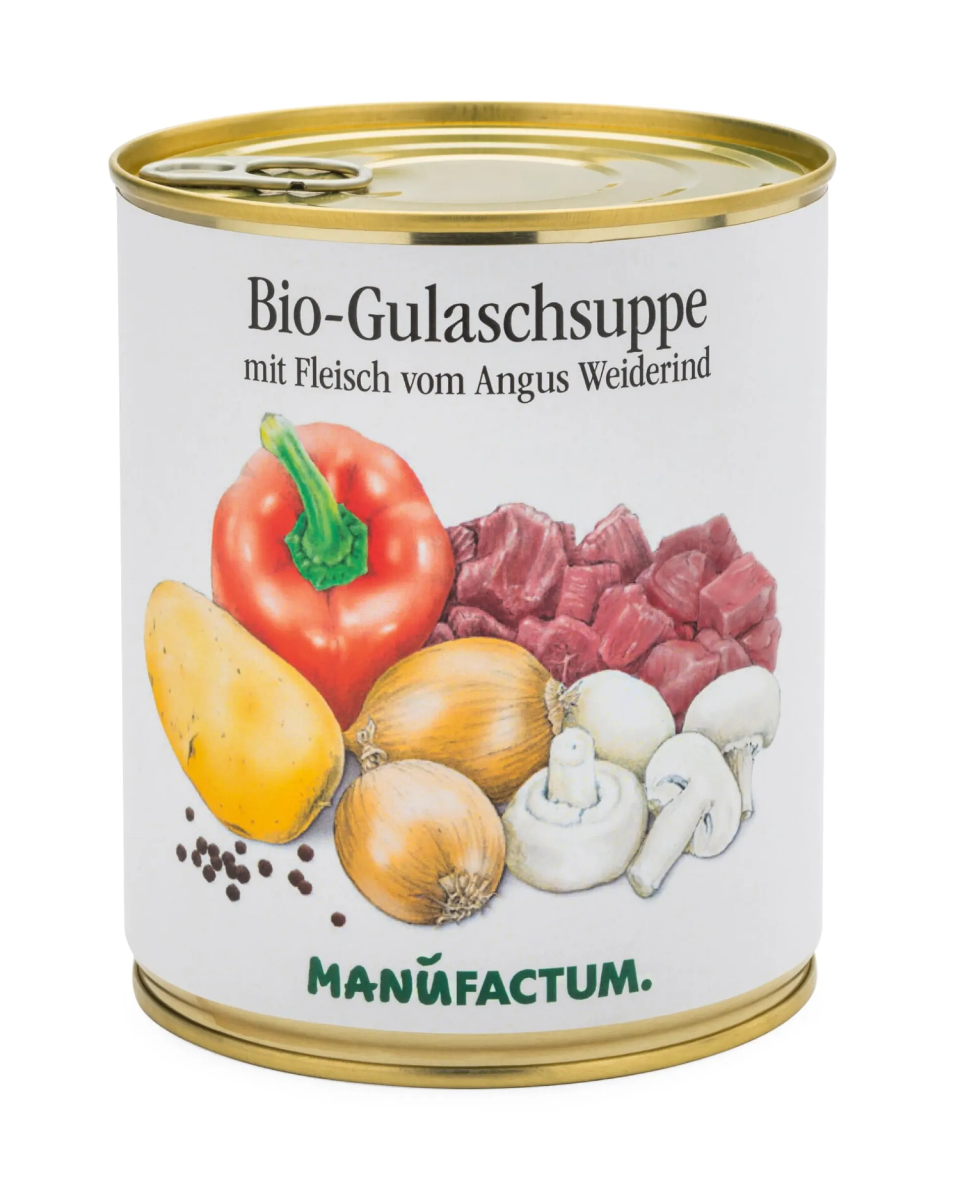Ihren kräftigen Geschmack verdankt diese traditionell mit Kartoffeln, Zwiebeln, Paprika und Pilzen zubereitete Gulaschsuppe in Bio-Qualität zuallererst der herzhaften Einlage aus saftigem Fleisch vom Angus-Weiderind. Wohlabgestimmte Gewürze runden den Genuss ab. Die Feinkost-Fleischerei Sostmann in Niedersachsen bereitet die Suppe für uns zu.