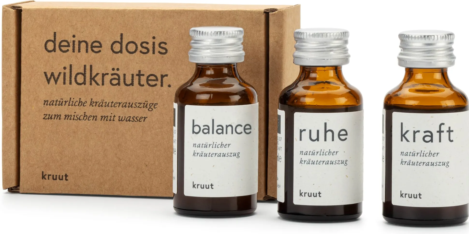 3 Flaschen à 15 ml: Bio-Kruut Kraft, Bio-Kruut Ruhe, Bio-Kruut Balance.