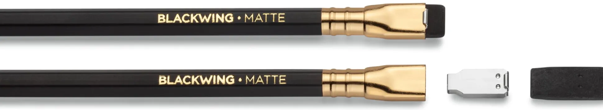 Blackwing: schwarzer Schaft, schwarzer Radierer. Härte ca. 6B. Sehr weicher, tiefsatter Strich, für Skizzen, manche bevorzugen ihn zum Schreiben.