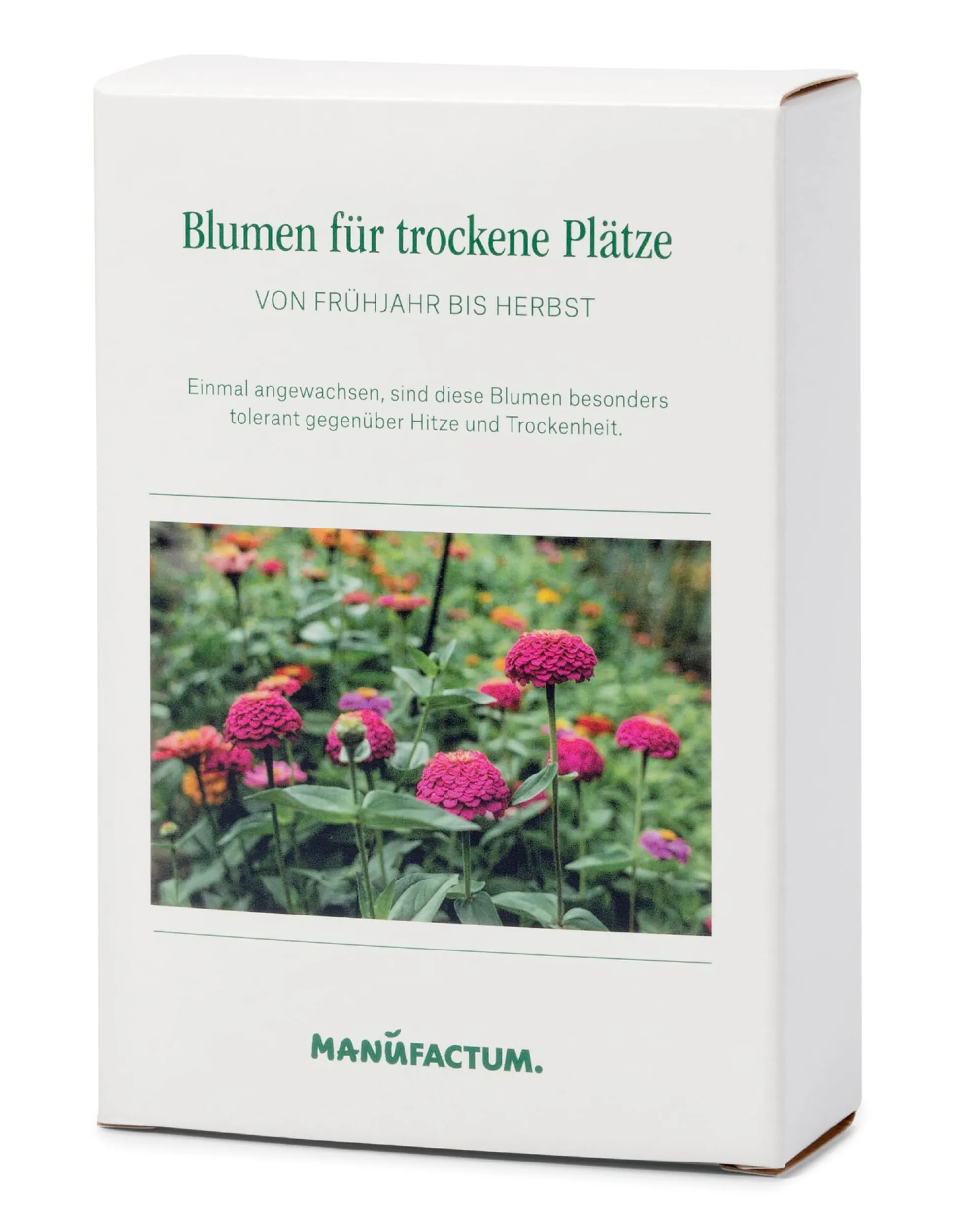 Und womit? Na, ganz einfach! Mit Blumen, und zwar solchen, denen Wärme und längere Regenpausen nichts ausmachen. Denn wenn wir einmal ehrlich sind: Auch in unseren Gärten ist der Klimawandel bereits spürbar angekommen. Zumindest an den zunehmenden Trockenphasen kommen wir nicht mehr vorbei, da schon die Frühjahrsmonate April und Mai inzwischen meist so warm sind wie der Sommer selbst und es in dieser Zeit auch kaum nennenswerte Regenfälle zu verzeichnen gibt. So setzt es sich die Saison über fort – häufig ist es einfach zu trocken. An heißen Standorten im Garten oder auf dem Balkon muss daher umgedacht werden, möchte man als Gärtner*in nicht ständig Verluste in Form von Vertrocknen beklagen – und mit den Gießwasservorräten in der Regentonne dennoch möglichst sparsam umgehen. Für unser exklusives Blumensämereien-Set haben wir acht Arten ausgewählt, die trockenheitsverträglich sind. Mexikanische Sonnenblume, Zinnie, Sonnenhut, Roter Lein und Kalifornischer Goldmohn, um nur einige zu nennen, erfreuen auch in heißen Sommern mit einem ausgesprochenen Blütenreichtum. Alle lassen sich einfach im eigenen Garten ziehen – einmal angewachsen, sind sie auch recht pflegeleicht. Beachten Sie nur, dass Sie in der Phase der Aussaat und nach dem Auspflanzen der Sämlinge in Ihre Beete zunächst regelmäßig gießen.