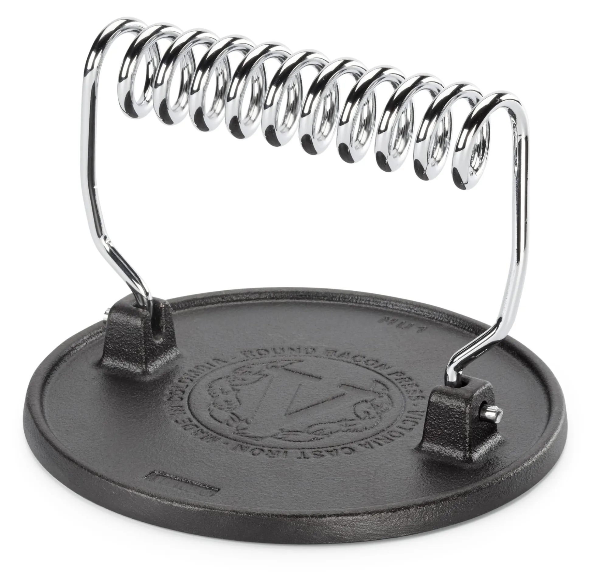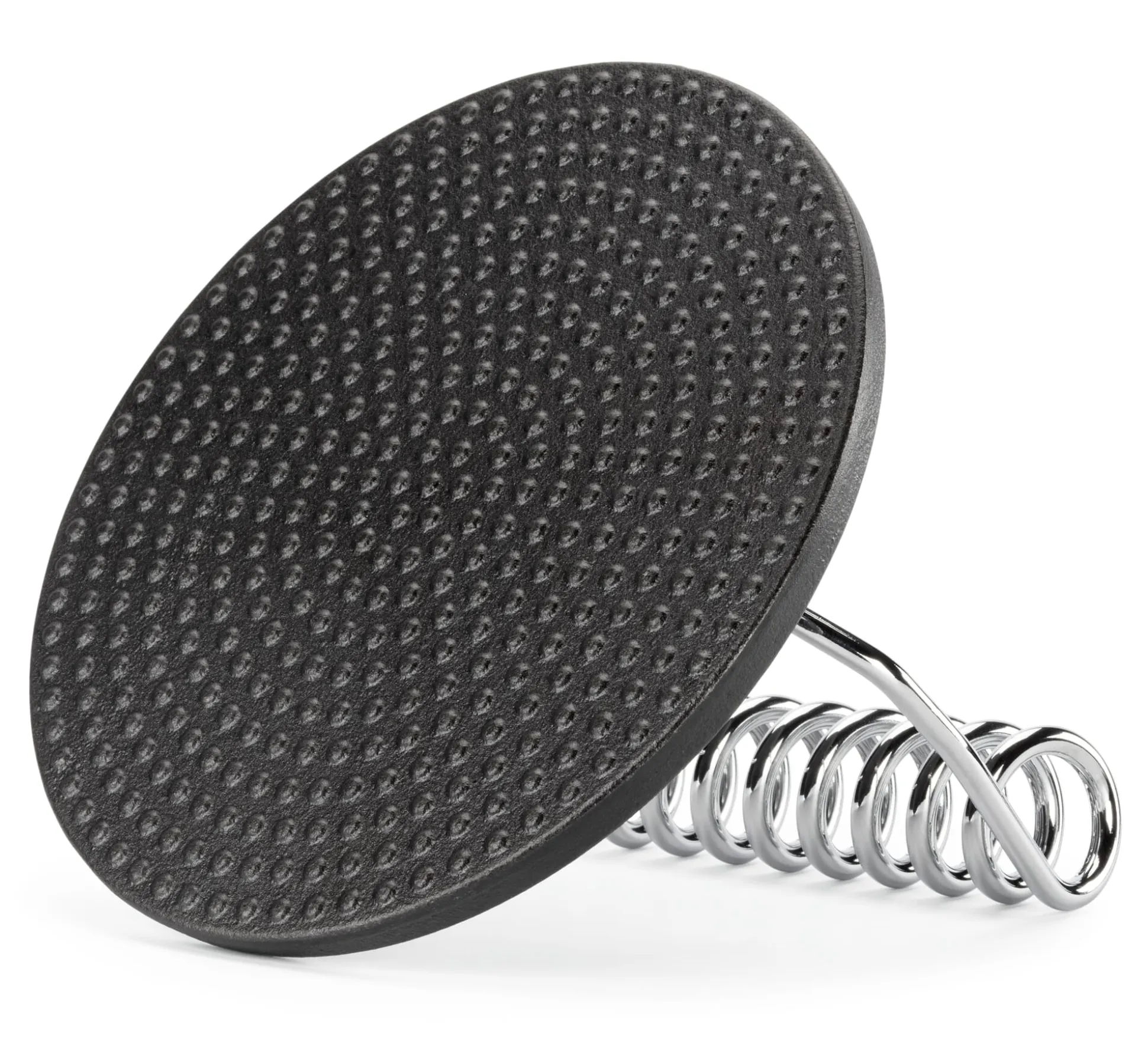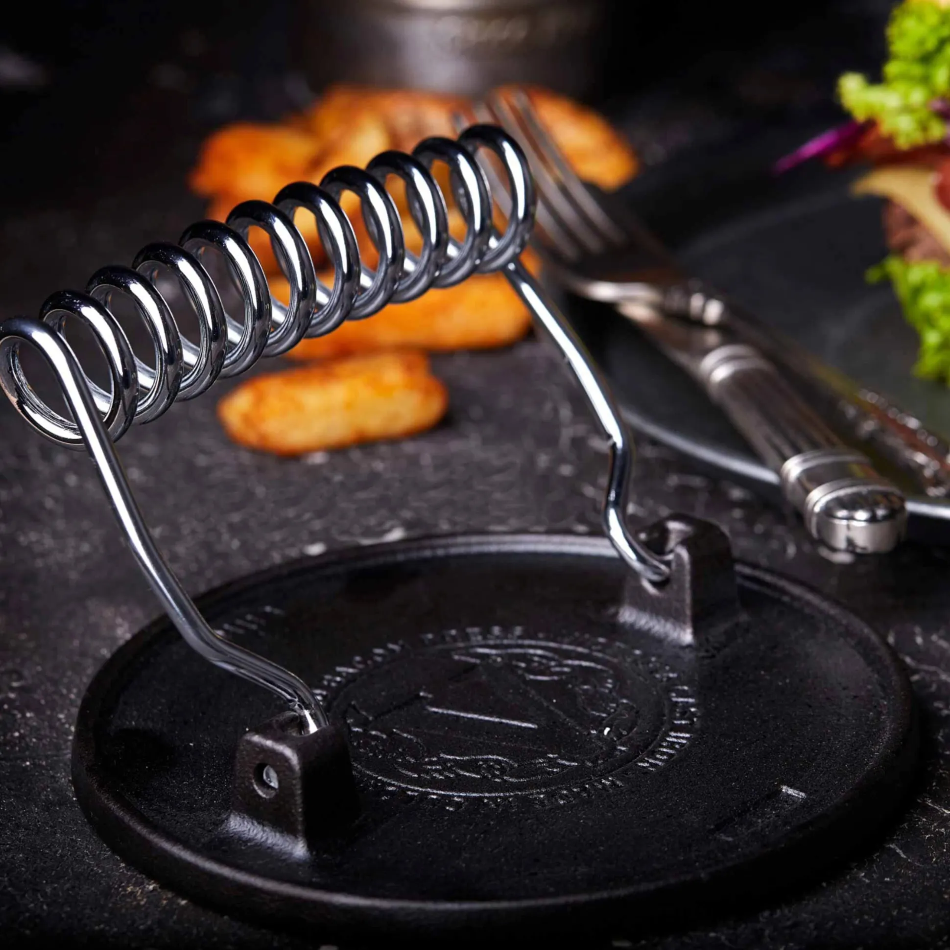 Das perfekte Werkzeug, um den vollflächigen Kontakt herzustellen, ist unsere Brat- und Grillgut-Presse. Aus Gusseisen gefertigt, bringt sie das richtige Gewicht mit. Der klappbare, spiralförmige Griff ist aus weniger wärmeleitfähigem Edelstahl gemacht und lässt sich daher auch ohne Topflappen gut greifen.