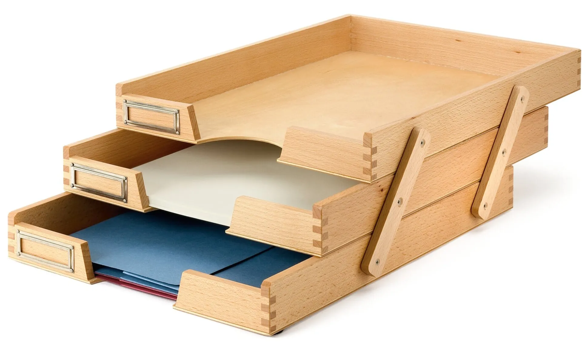 Schreibtischablagen gibt es viele, die meisten davon erweisen sich im Alltagsgebrauch jedoch als wenig tauglich. Sie kommen einzeln und lassen sich häufig allenfalls zu fragilen, klappernden Türmen aufschichten. Diese stabile Ablage aus Buchenholz mit drei beweglichen Briefkörben schafft Ordnung auf dem Schreibtisch. Dank der verbindenden Schenkel können die Körbe treppenartig aufgeklappt oder geschlossen übereinandergestellt werden – alles passgenau und ohne zu klappern. Das Prinzip erinnert nicht von ungefähr an ein Nähkästchen: Der Briefkorb entsteht in einer Werkstatt im Frankenwald, die uns seit Jahren mit ebensolchen beliefert. Die Rahmenteile sind mittels Fingerzinken stabil verbunden, Filzfüße schonen die Schreibtischoberfläche bzw. -unterlage. Zur besseren Übersicht – auch im geschlossenen Zustand – ist jedes Fach mit einem Etikettenfenster versehen.