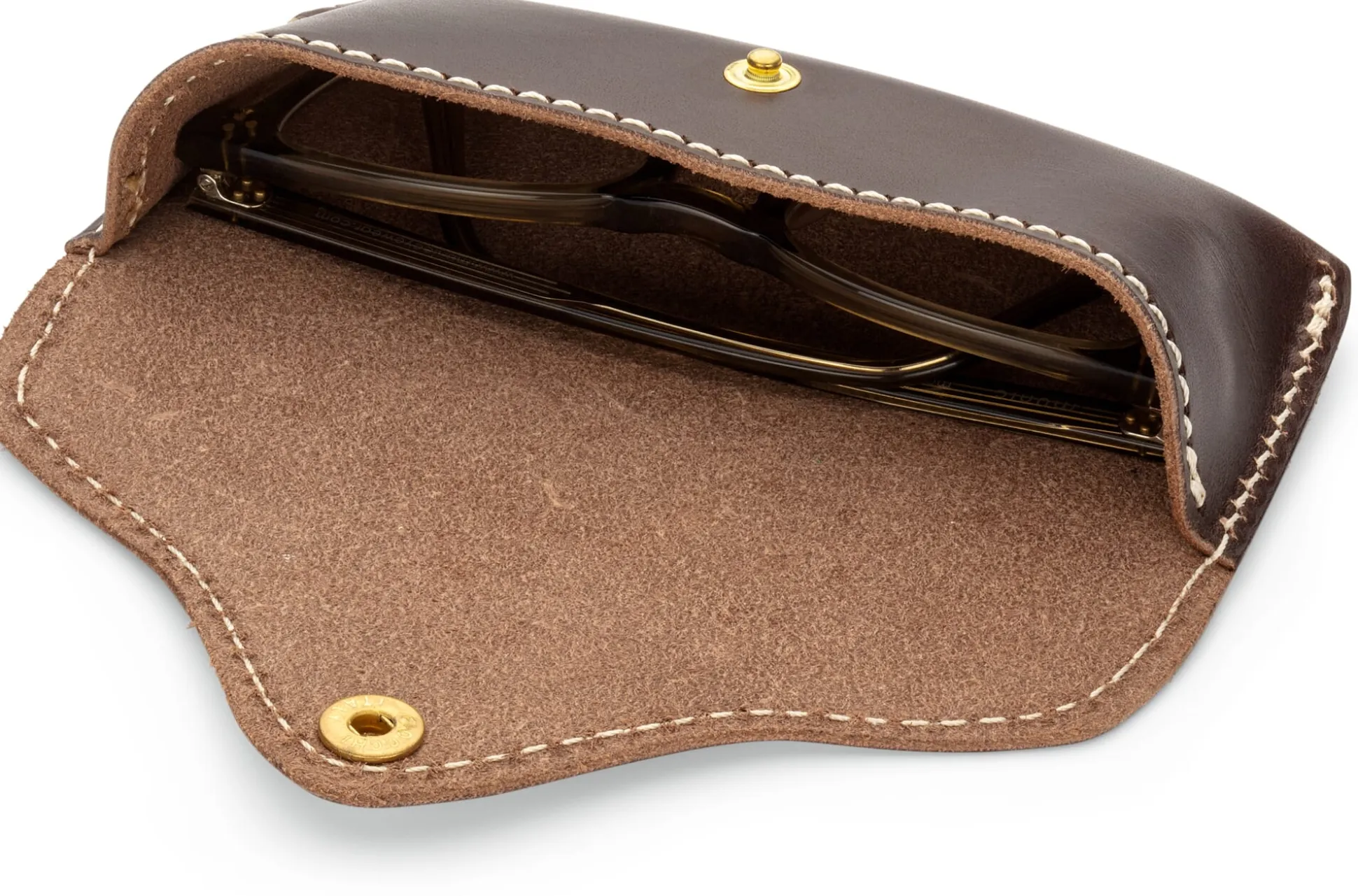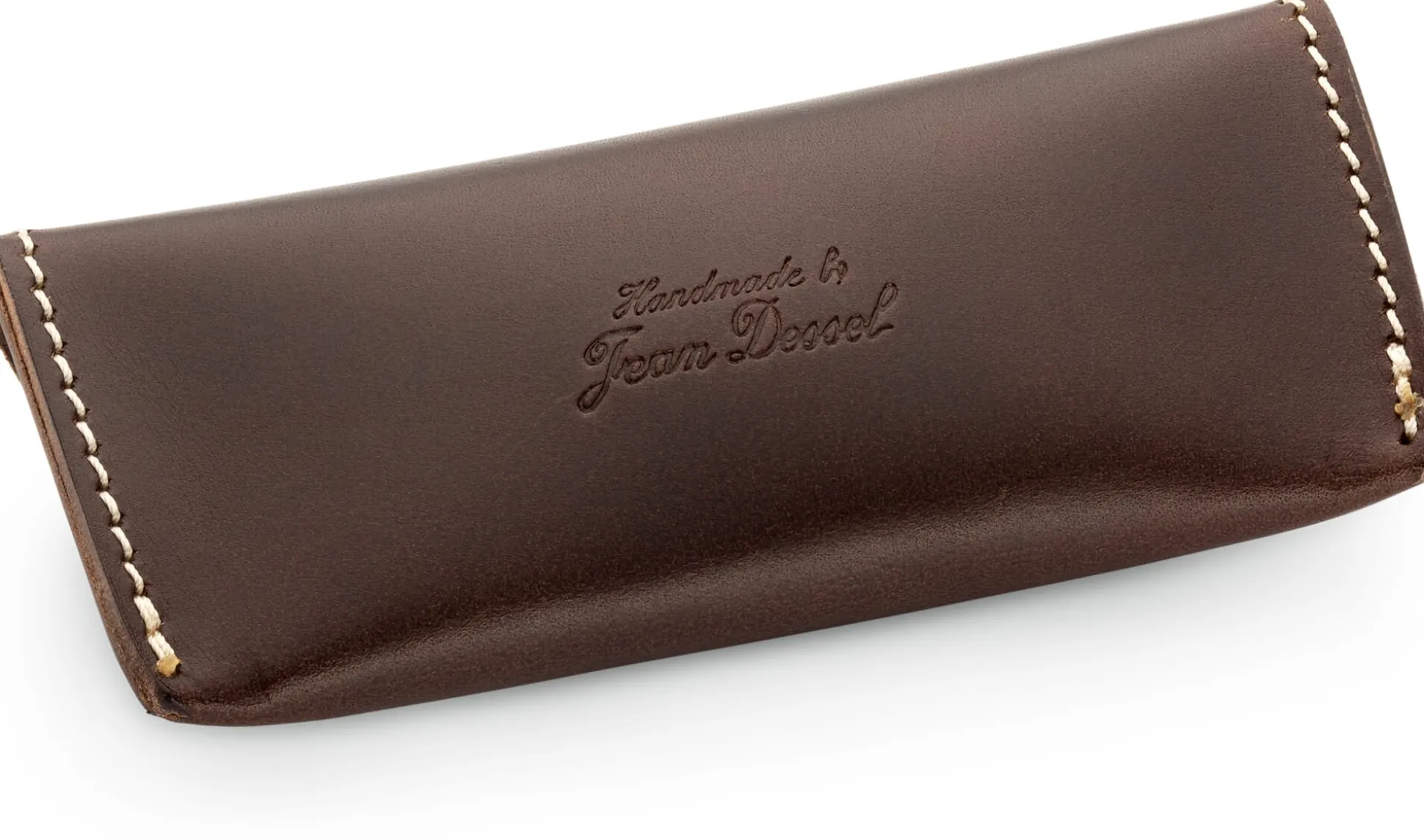 Aus kräftigem und doch geschmeidigem Rindleder gefertigt, verwahrt dieses Etui sanft schützend Sonnenbrille, Lesebrille, Arbeitsplatzbrille … Zugegeben, für eine Skibrille mag es zu klein sein, eine Brille üblicher Größe aber werden Sie darin unterbringen und transportieren können. Die auffallend schlichte Gestaltung folgt gekonnt der Funktion: Das Brillenetui ist aus einem einzigen Stück Leder gearbeitet, der schmal zulaufende Überschlag schließt mit einem soliden Druckknopf. Die helle, sorgfältig gesetzte Steppnaht entlang der offenkantig gearbeiteten Ränder sichert zum einen die Form des Brillenetuis und setzt zum anderen einen optisch markanten Kontrast zum dunklen Leder.
