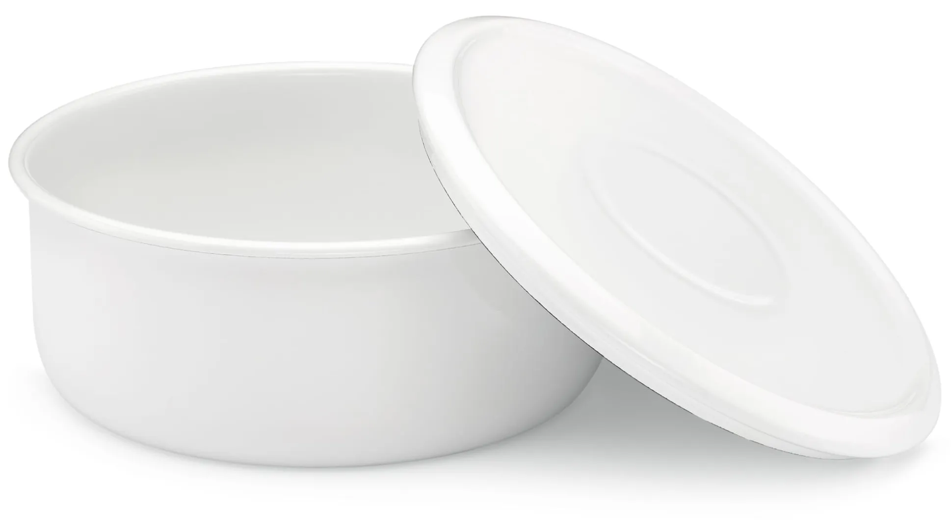 Stahlblech weiß emailliert. Volumen 4,5 l, Ø 26 cm, Höhe 11,5 cm. Gewicht 1,1 kg.