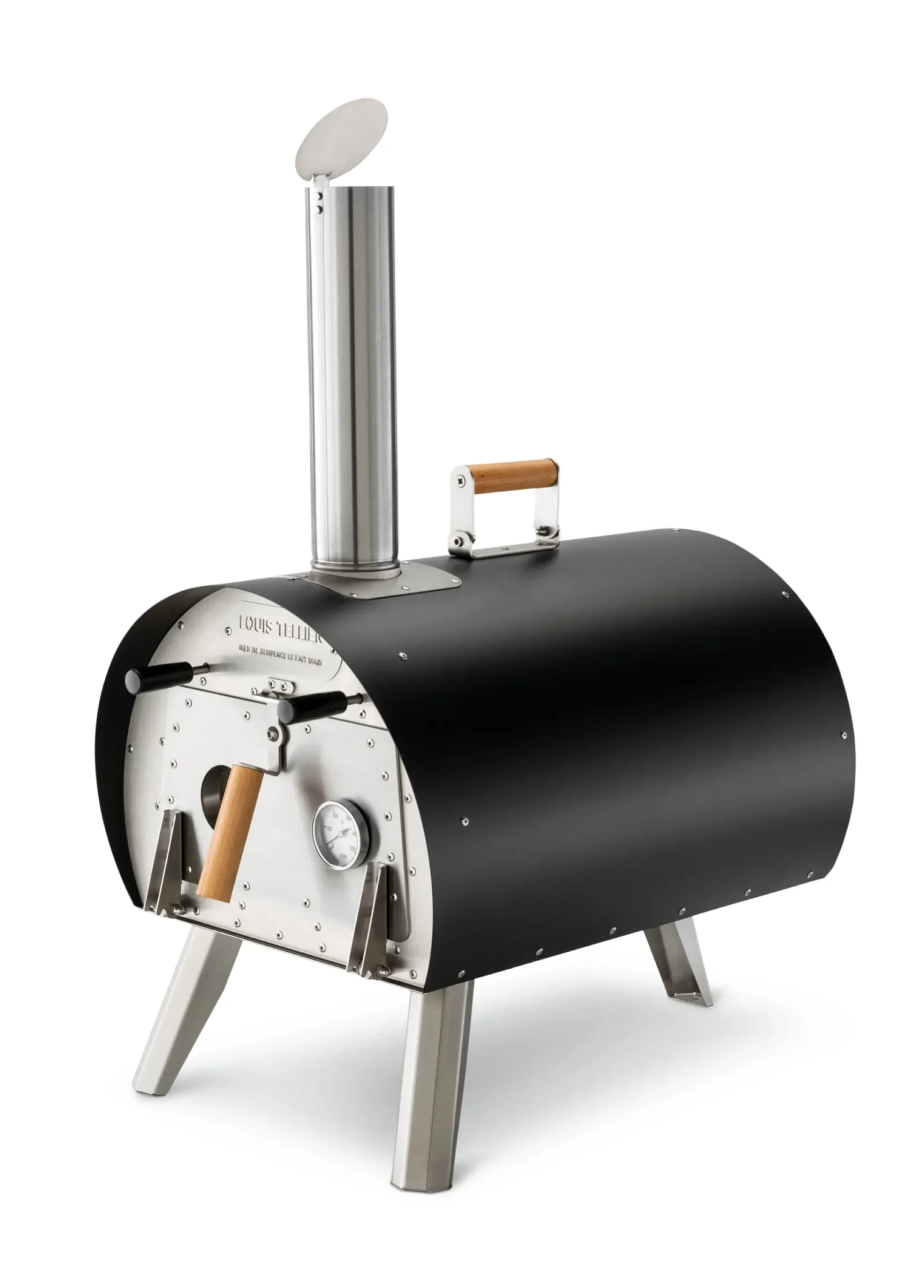 Edelstahl, Abdeckung schwarz beschichtet. Keramikisolierung innen. Klappbarer Handgriff mit Grifffläche aus Holz an der Oberseite, Ofentür mit Holzgriff. Drei einklappbare Stellfüße. Feuerkorb (34,5 × 16 cm; inkl. Griff 27 cm tief) mit herausnehmbarem Einsatz (29,5 × 10 cm) und regulierbaren Lüftungsschlitzen an der Rückseite. Temperaturbereich bis 500 °C, ein in die isolierte Ofentür integriertes Thermometer gibt präzise Auskunft. Lieferung inklusive Pizzastein (L 37 × B 33 × H 1,5 cm. Gewicht 4 kg). Länge 75 cm, Breite 44 cm, Höhe (mit Ofenrohr) 95 cm. Gesamtgewicht 37 kg.