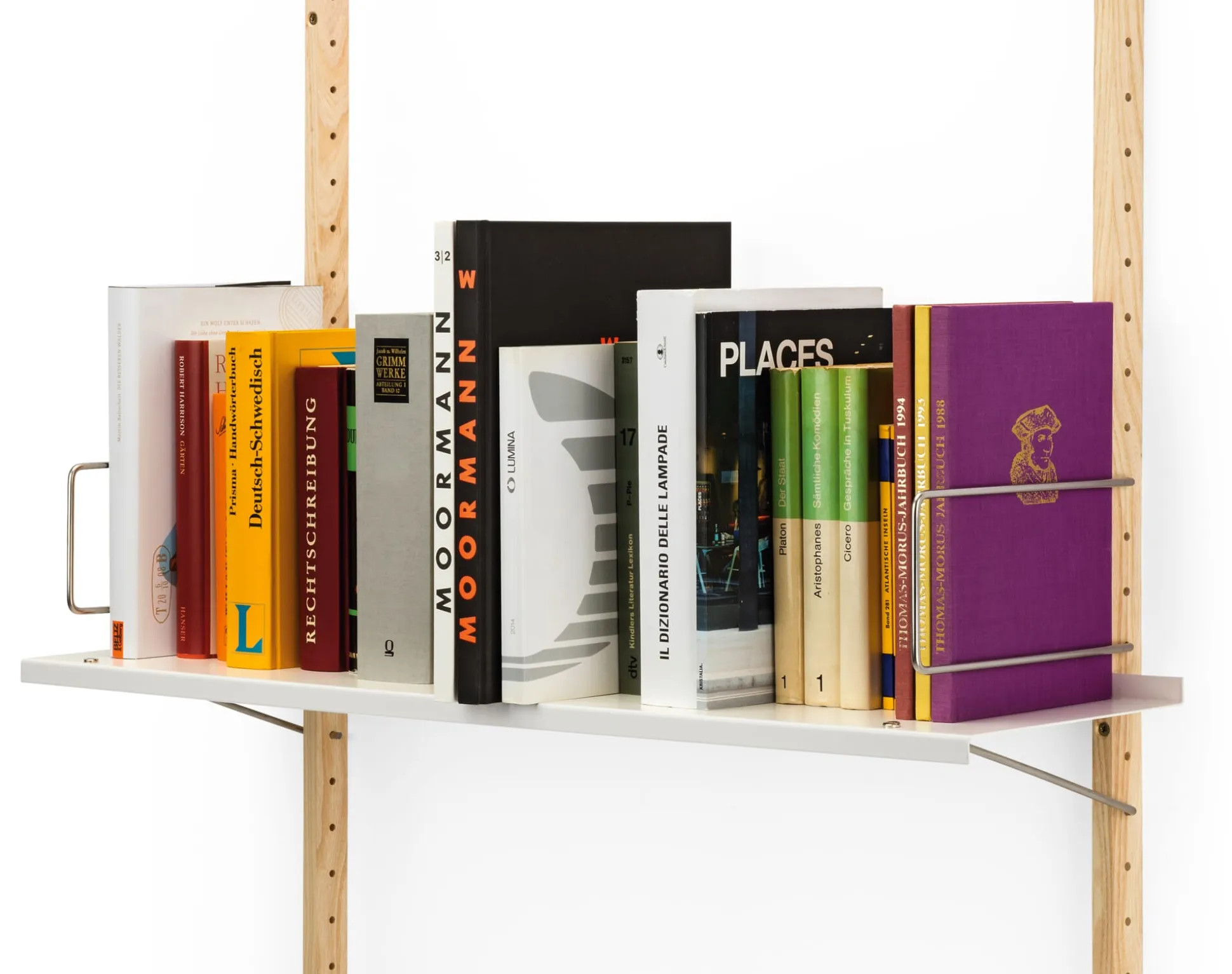 Buchstütze aus Edelstahldraht begrenzen das Volumen des Fachbodens. Nach dem Prinzip der Fachbodenträger greifen die Bügel seitlich in die Wandprofile.
