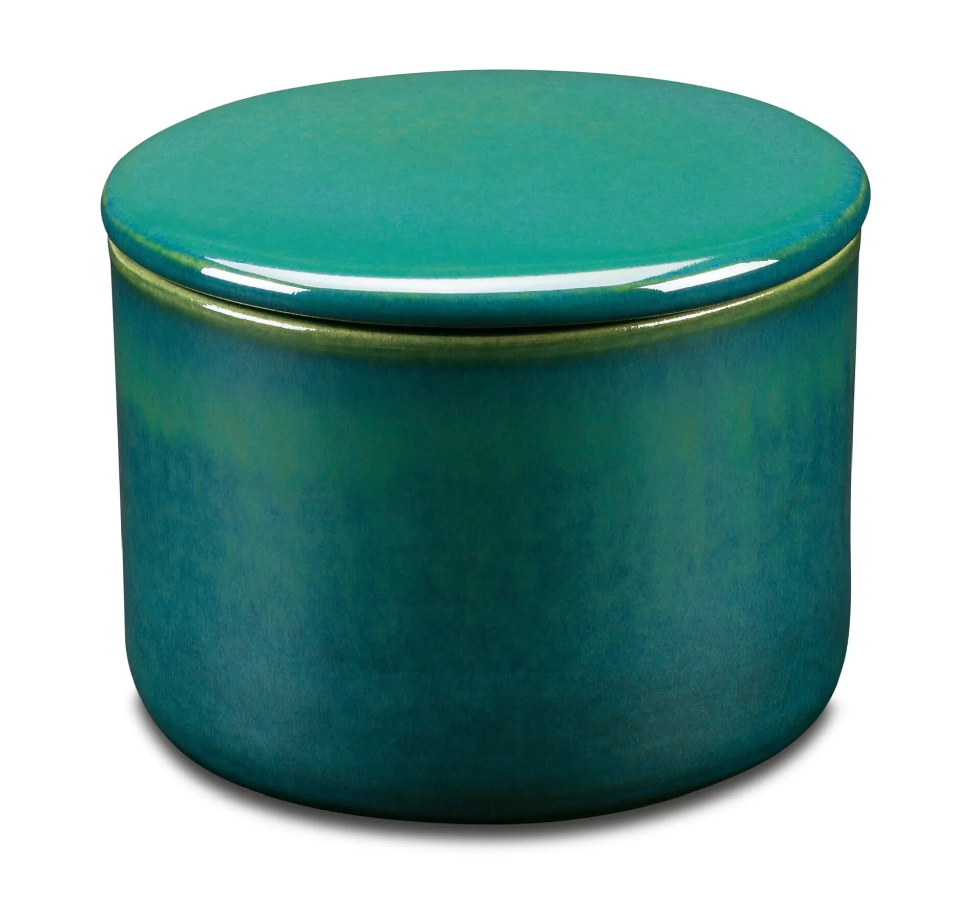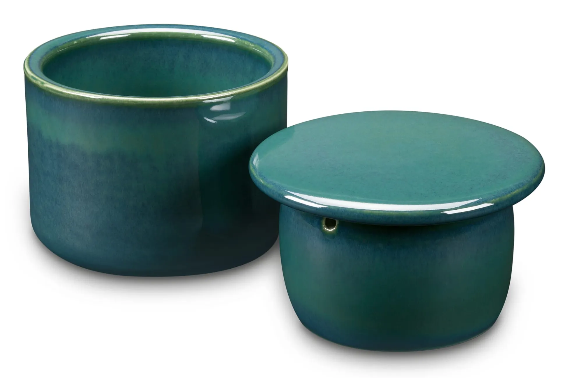 Zweiteilig, aus Westerwälder Feinsteinzeug. Oberteil mit 2 Wasserabflusslöchlein. Gesinterte Keramik, außen und innen grün glasiert. Wir empfehlen, das Wasser im Unterteil der Butterdose etwa alle drei Tage auszutauschen.