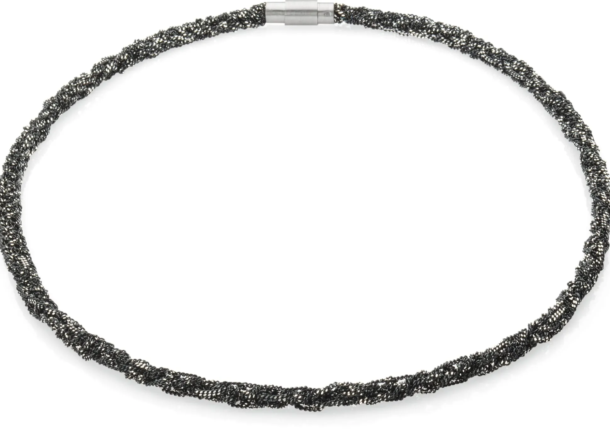 Feinen Silberdraht zu diesem gestrickten Collier zu verwandeln, verlangt Aufmerksamkeit und Fingerspitzengefühl: Zunächst wird er zu schmalen Ketten geflochten und oxidiert, um die insgesamt dunkle Optik zu erzielen. Anschließend werden die Ketten diamantiert – die winzigen Kettenglieder werden mittels diamantbesetzter Schleifwerkzeuge angeschliffen und poliert, bis sie das Licht reflektieren und für funkelnden Glanz sorgen, der eben nicht von eingesetzten Schmucksteinen sondern vom Silber selbst herrührt. Zu guter Letzt werden die schmalen Panzerketten zu einem Strang verbunden – in reiner Handarbeit. Verblüffend beim ersten Berühren: Das Collier schmiegt sich gut an die Haut an. Der klar gestaltete Magnetverschluss ist ebenfalls aus Silber gearbeitet, bei ihm ist es gebürstet. Übrigens: Mit dem passenden Armband können Sie das Collier bei Bedarf verlängern.