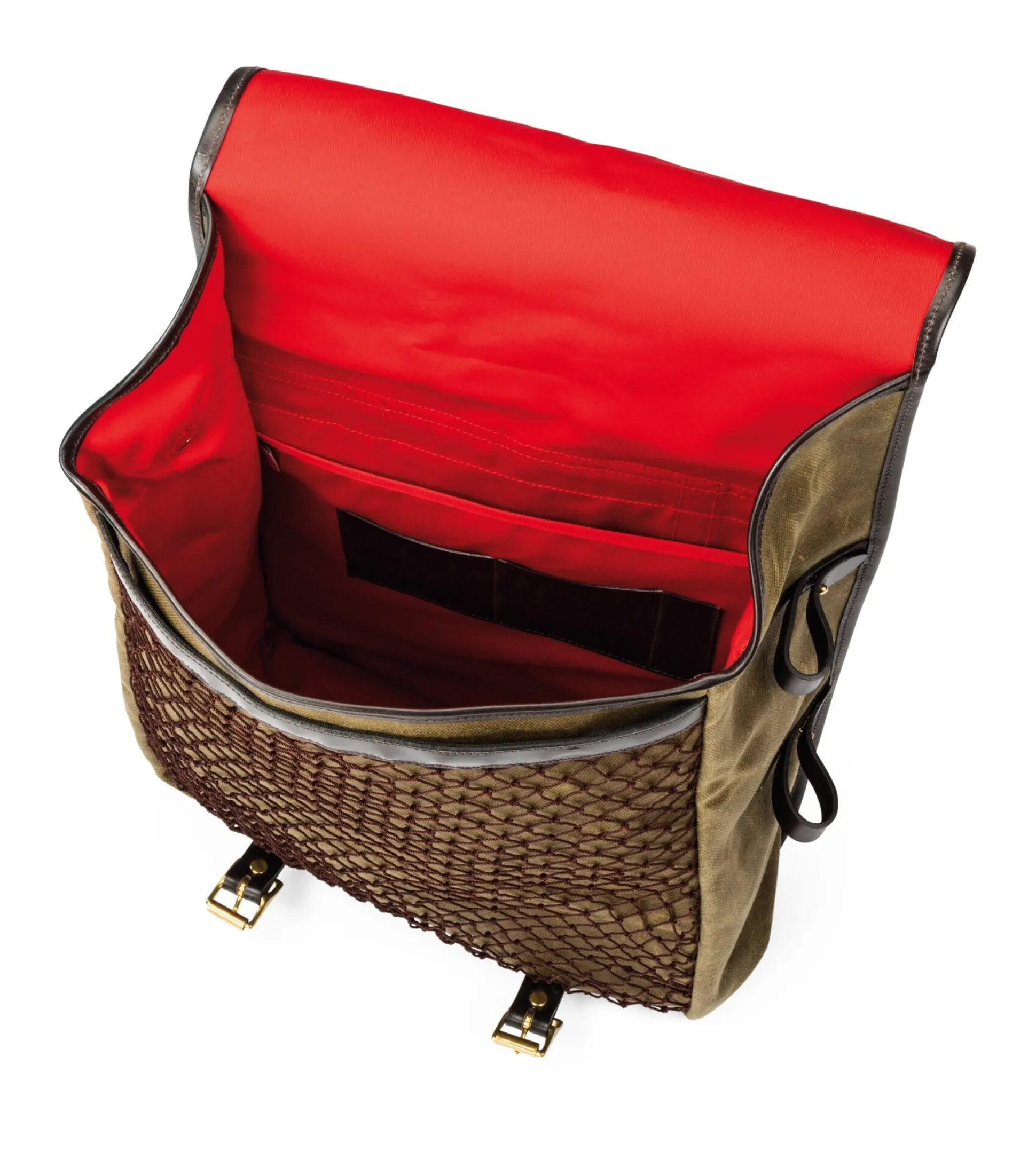 Canvas aus 100% Baumwolle (Flächengewicht 680 g/qm), Farbe Olive. Futter 100% Baumwolle, Herkunft Großbritannien. Farbe Rot. Enthält nichttextile Teile tierischen Ursprungs: Tragegriff, Schlaufen und umlaufende Riemen aus Rindleder (Stärke 3 mm, Breite 2,4 cm), vegetabil gegerbt, Herkunft England, Farbe Dunkelbraun. Beschläge aus Messing. Stufenlos verstellbare Schultergurte aus Baumwollcanvas, Breite 4 cm, Länge max. 1,15 m. Die Vorderseite ist mit einer Netztasche versehen. Das große Hauptfach ist mit einem Steckfach sowie zwei Steckfächern aus Leder für Kleinteile und einem Stiftefach gearbeitet. Hergestellt in Großbritannien.