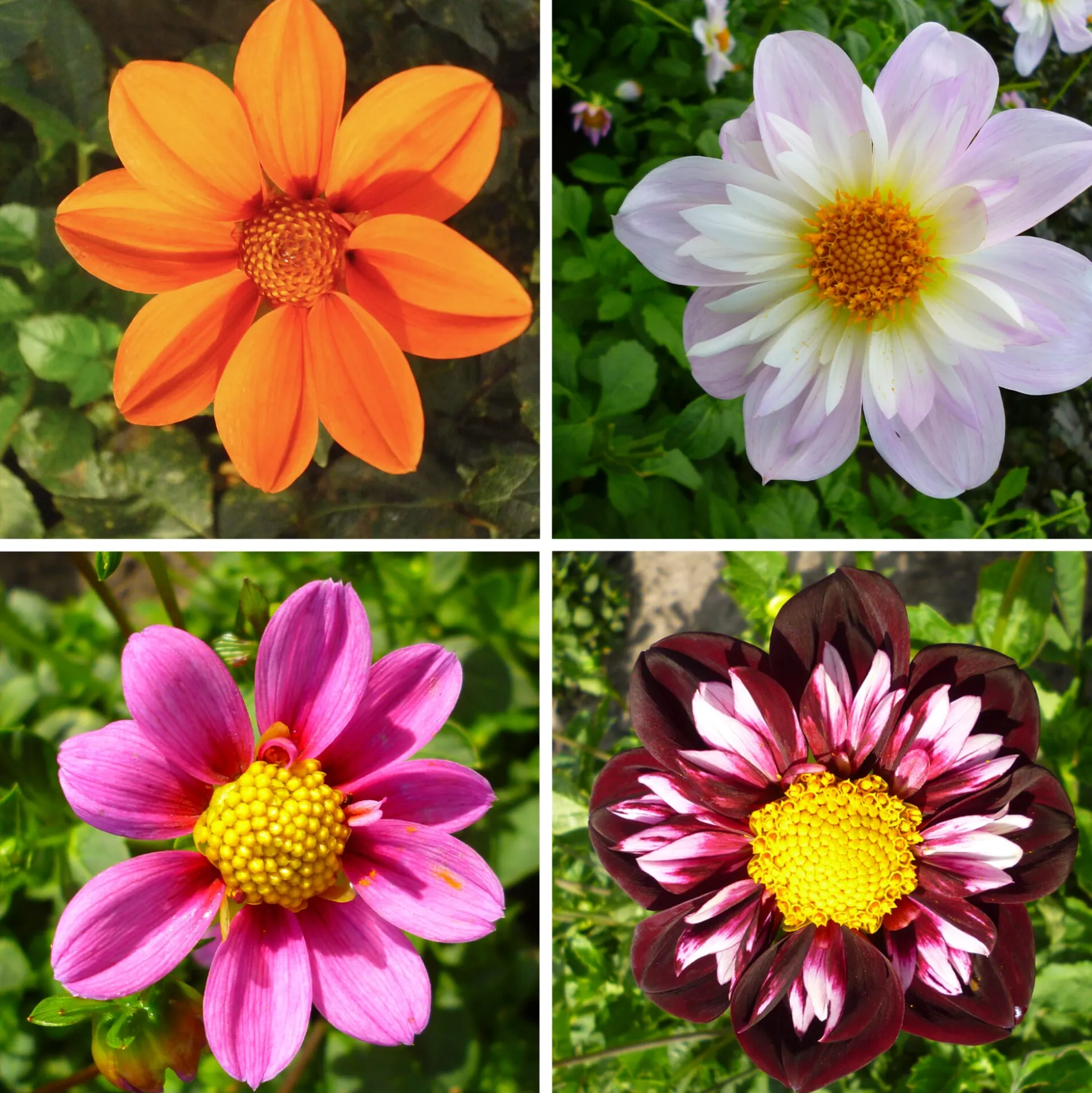 Vier Dalienknollen. Je eine der Sorten ‘Bonne Esperance‘, ‘Flamme‘, ‘Night Butterfly‘ und ‘Teesbrooke Audrey‘.