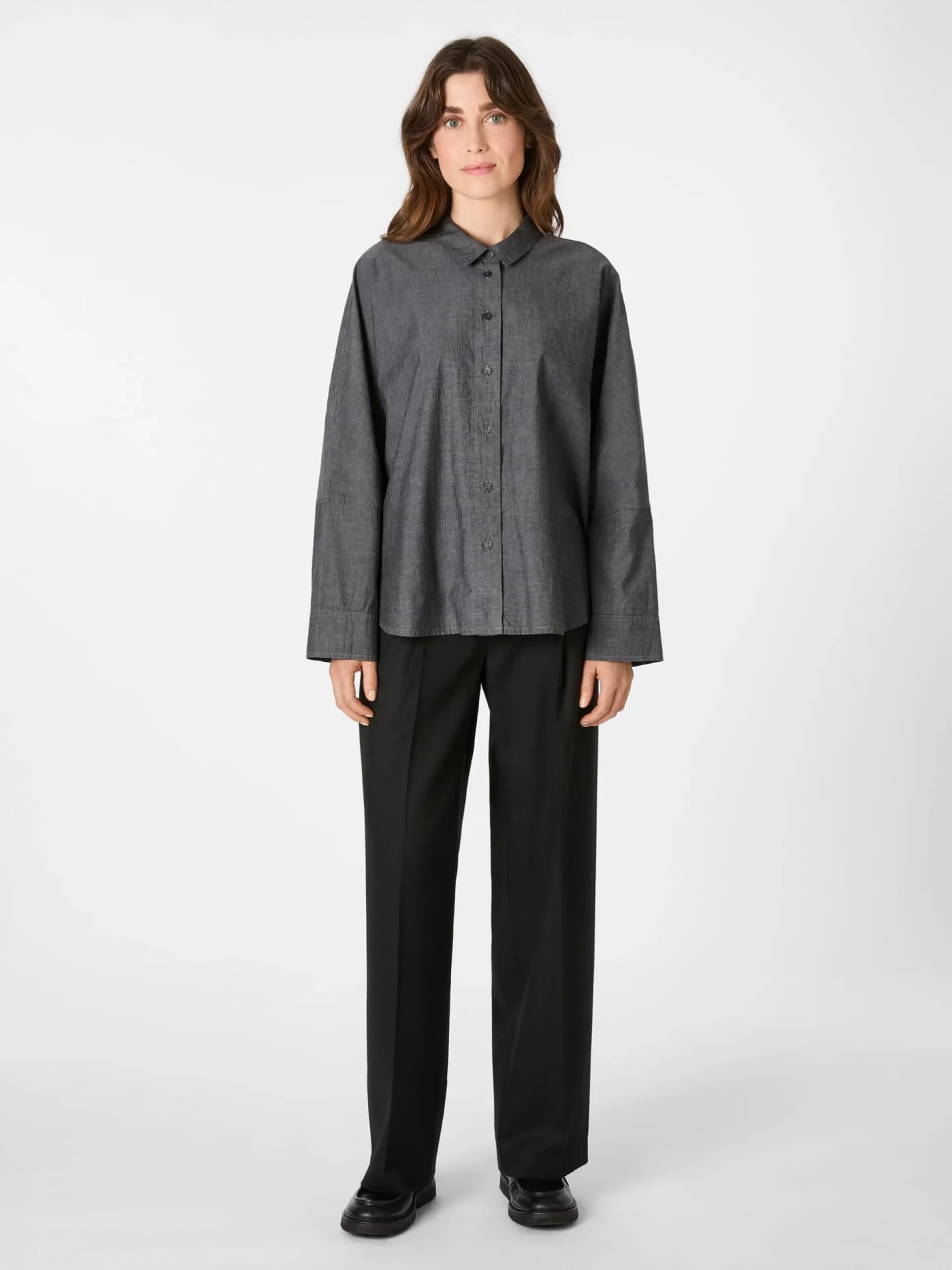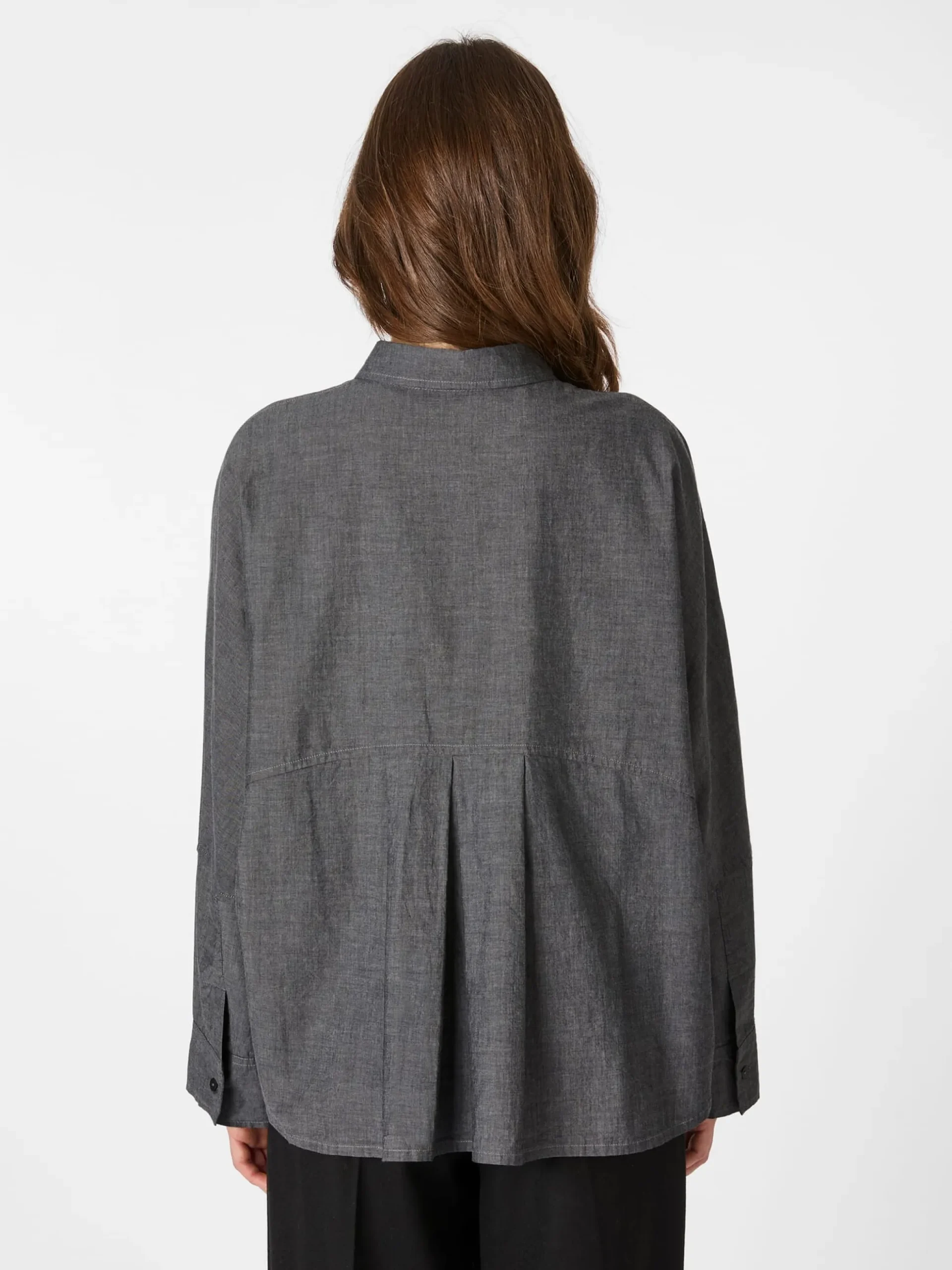 Diese leger geschnittene Bluse konfektioniert Oska aus einem angenehm glatt auf der Haut liegenden Chambray aus reiner, hautsympathischer Baumwolle. Bei Chambray handelt es sich um einen leichten, dicht gewebten Stoff, bei dem Kett- und Schussfaden verschiedenfarbig sind, was ihm den charakteristischen Melangeeffekt verleiht. Gearbeitet ist die durchgeknöpfte Bluse mit Kentkragen, geknöpften Ärmelöffnungen und gerundetem Saum. Die Passform ist Oska-typisch überschnitten – für einen lässigen, entspannten Look. Die Kellerfalte und die gelegten Falten unter der gerundeten Schulterpasse sorgen für einen guten Sitz und noch mehr Bewegungsfreiheit.