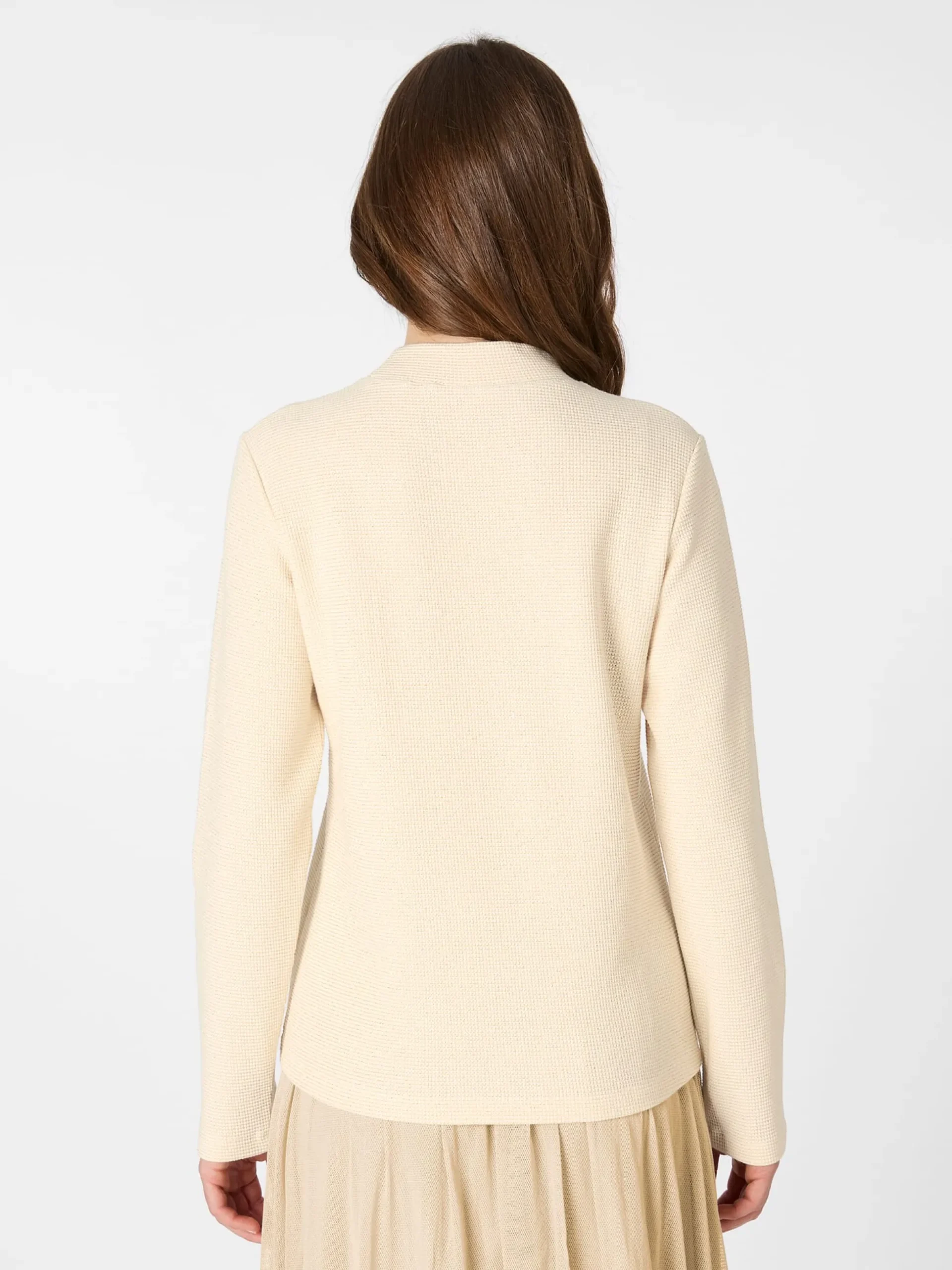 Die Raffinesse offenbart sich bei diesem schlicht und klassisch geschnittenen Langarmshirt erst auf den zweiten Blick: Der Waffeljersey, aus dem es gestrickt ist, zeigt ein dezentes Glitzern. Dafür sorgen feine silber- und goldfarbene Metallfäden, die allerdings nur oberflächlich in das Material eingearbeitet sind. So liegt das Shirt schmiegsam auf der Haut. Alma & Lovis fertigt es aus hautsympathischer, kontrolliert biologisch angebauter Baumwolle. Hinzu kommt ein geringer Anteil Polyamid, der für mehr Elastizität und Formtreue sorgt. Gearbeitet ist das Shirt in lockerer Passform mit geradem Saum und Stehkragen.