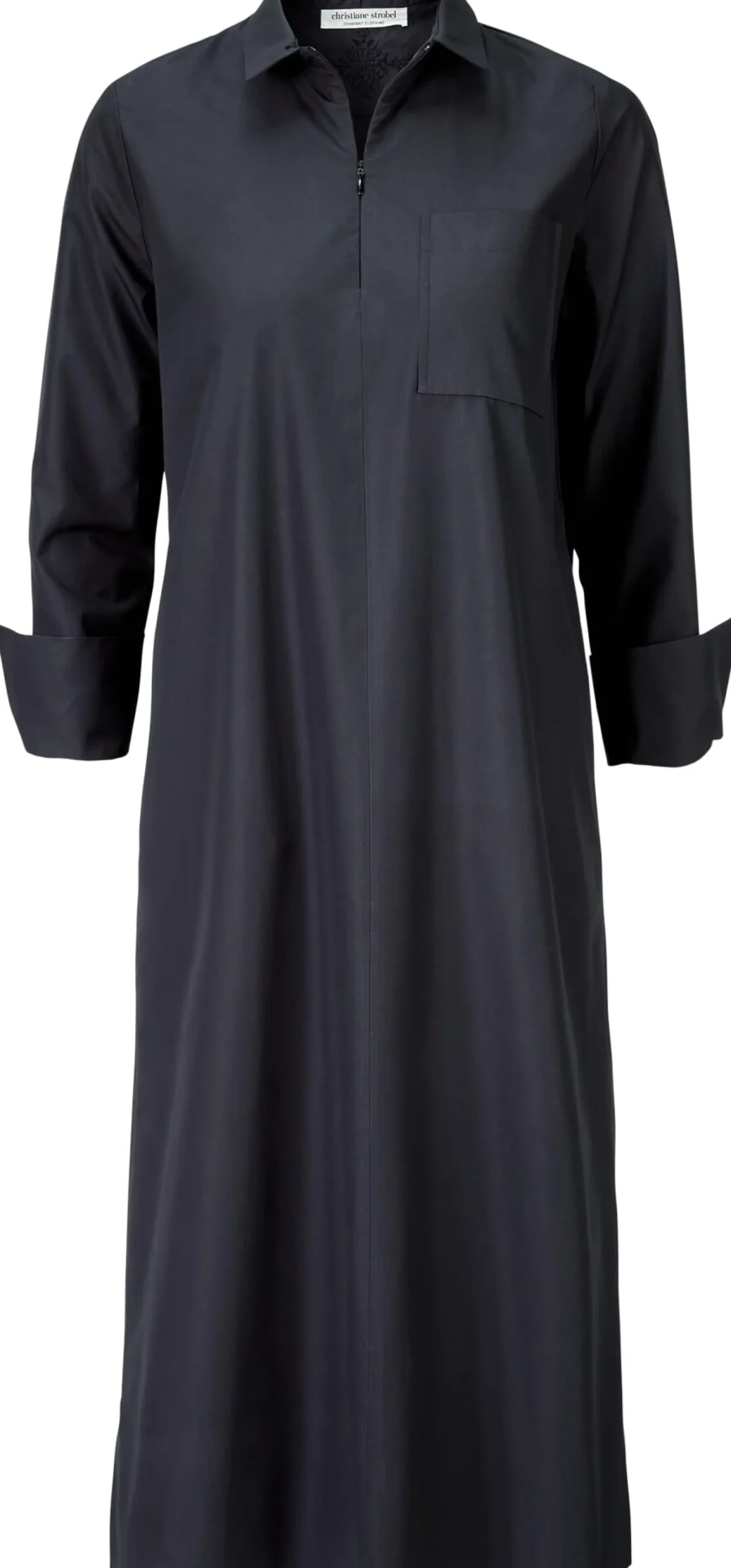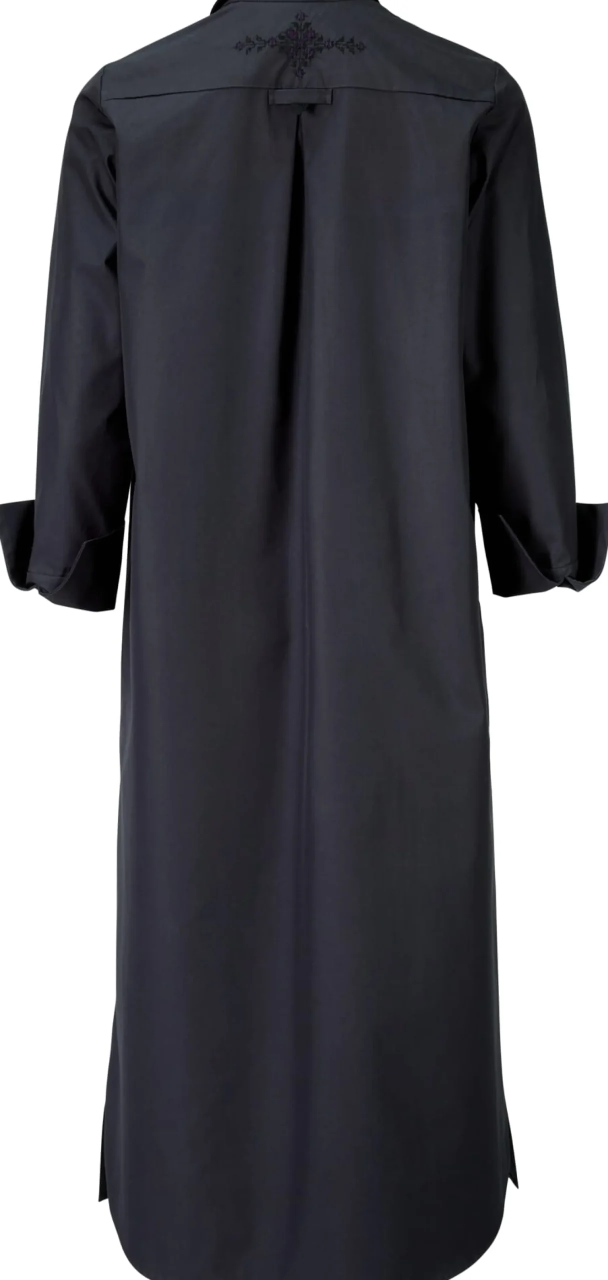 Dieses überschnittene Hemdblusenkleid in Midilänge ist aus kontrolliert biologisch angebauter Baumwolle gefertigt. Es ist mit einer Brusttasche, zwei Seitennahttaschen und dreiviertellangen Ärmeln mit geschlitzten Manschetten ausgestattet. Der Rumpfsaum ist vorn gerade und hinten gerundet. Für eine sportliche Note sorgt der schmale Nahtreißverschluss, mit dem sich das Kleid auch hochgeschlossen tragen lässt. Die Kellerfalte unter der Schulterpasse erhöht den Tragekomfort, und die detailreiche Fassi-Stickerei im Nacken – handmade in Marrakesch – macht jedes Stück zum Unikat.