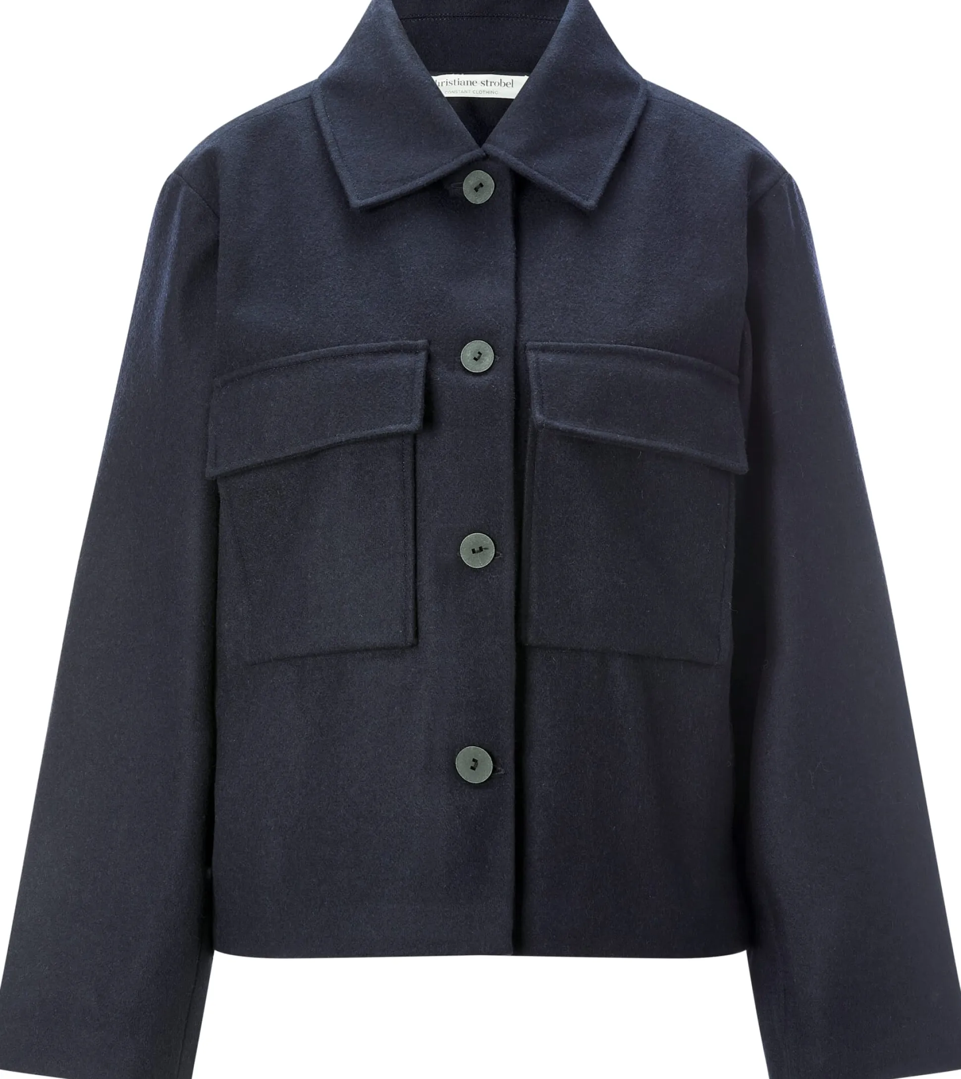 Dank ihrer geraden, legeren Passform und der verwendeten Materialien ist diese Hemdjacke überaus komfortabel und eine ideale Begleiterin für frische Herbst- und Frühlingstage oder kühle Sommerabende. Christiane Strobel fertigt den Oberstoff aus einem dichten, wärmenden Wolltuch, das Futter aus reiner, hautsympathischer Baumwolle. Gearbeitet ist die Jacke mit zwei großen, aufgesetzten Brusttaschen mit Patte und geradem Saum. Weitere schnitttechnische Details sind die Querteilungsnaht am hinteren Saum sowie eine Längsteilungsnaht im Rücken, die die Silhouette optisch verschlankt. Abgerundet wird das Design durch die in Japan handgefertigten Papierknöpfe und das handgestickte Dreieck am rückseitig angebrachten Riegel.