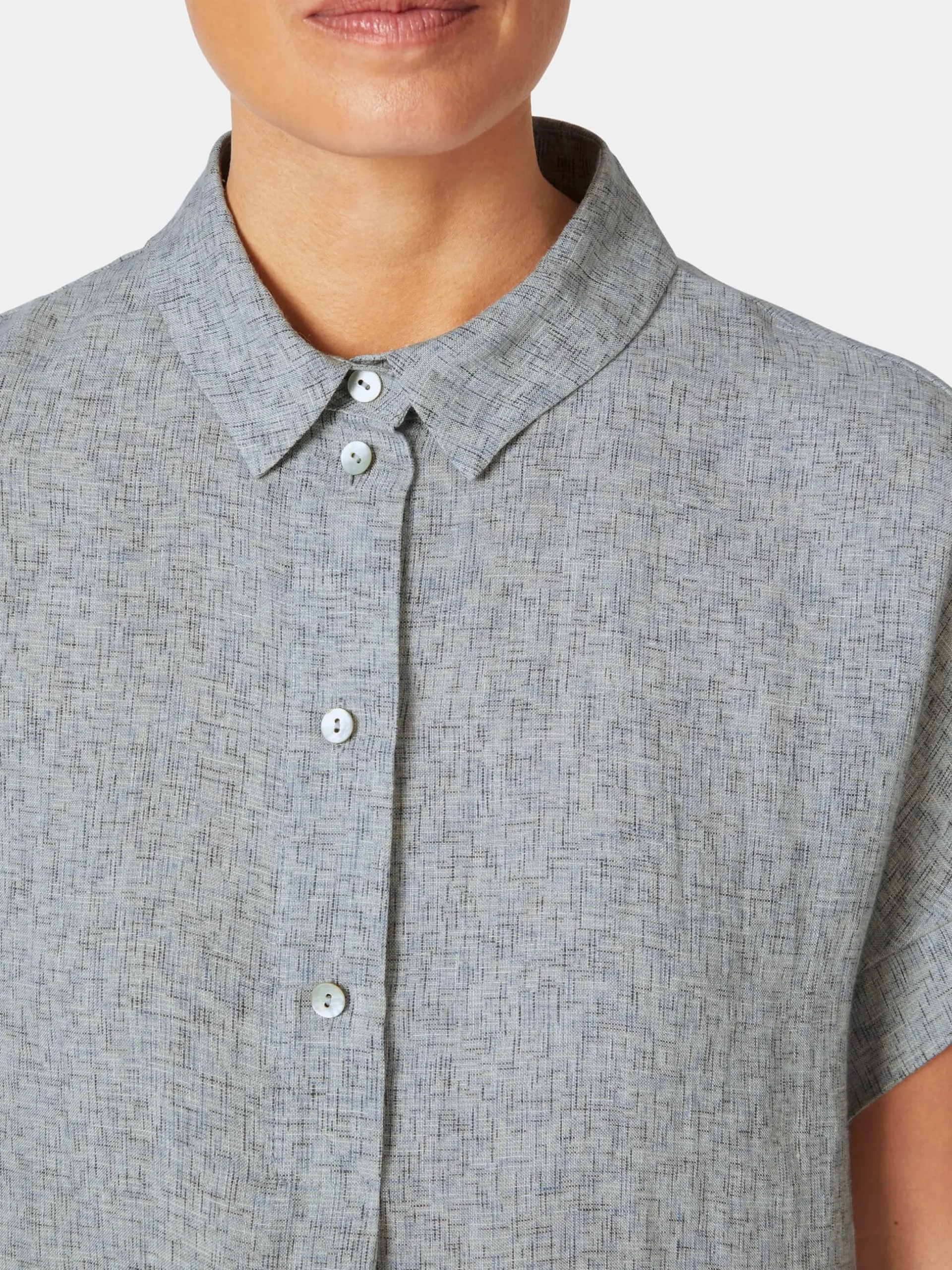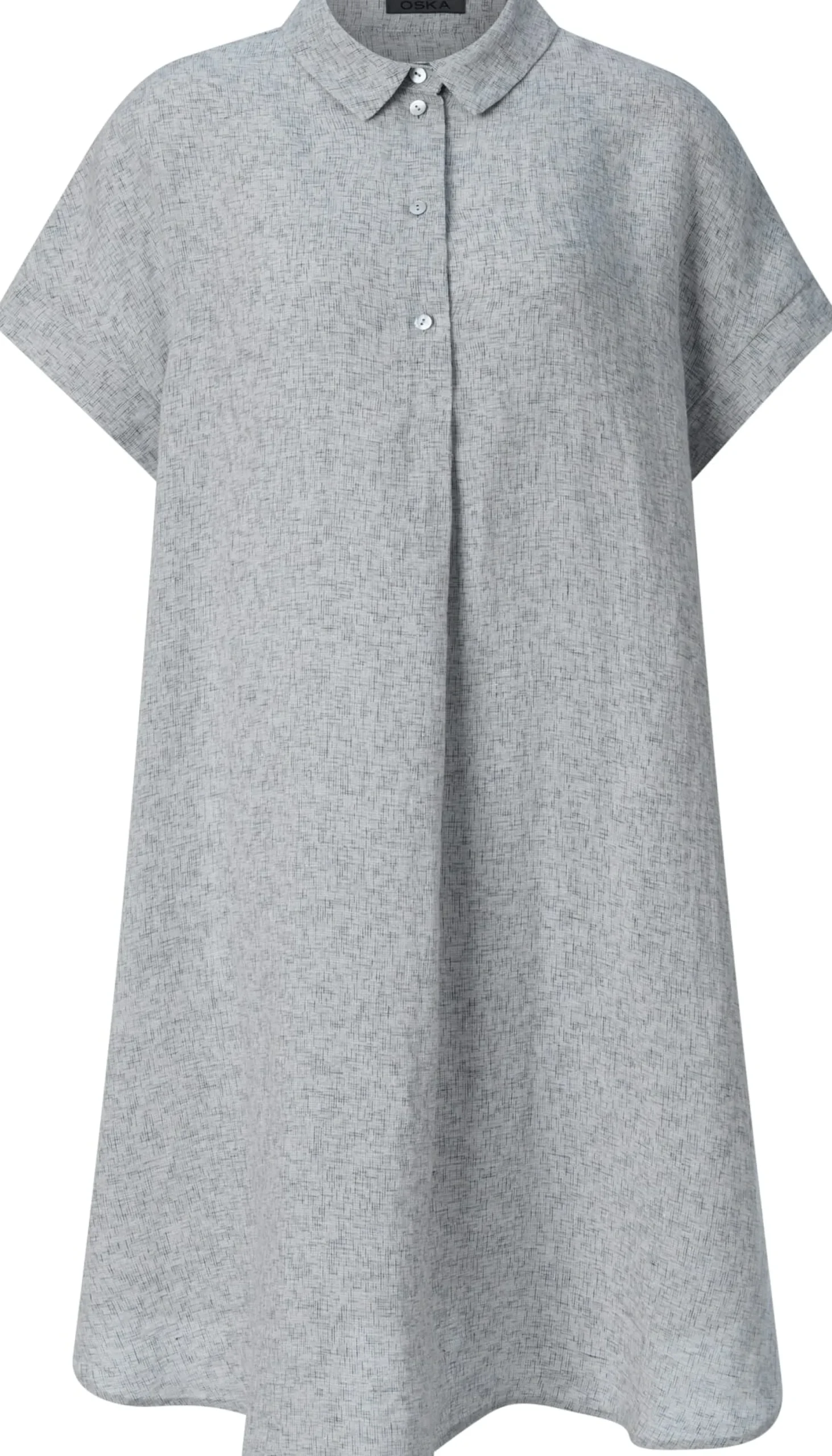 Leinen ist das Material der Wahl für die warme Jahreszeit, denn die Faser hat die Eigenschaft, große Mengen an Feuchtigkeit aufzunehmen und zügig wieder abzuleiten, sodass ein angenehm kühlender Effekt auf der Haut entsteht. Aus diesem luftigen und hautsympathischen Sommerstoff fertigt Oska dieses kurzärmelige Kleid in lockerer, bequemer Passform. Durch die Verwendung verschiedenfarbiger Garne zeigt das Gewebe ein subtiles Strichmuster, das dem Kleid zusammen mit den schimmernden Perlmuttknöpfen eine elegante Optik verleiht. Gearbeitet ist es mit zwei in die Seitennaht eingesetzten Taschen und gerundetem Saum. Die Knopfleiste geht in eine aufspringende Falte über, was für einen guten Sitz und mehr Bewegungsfreiheit sorgt.