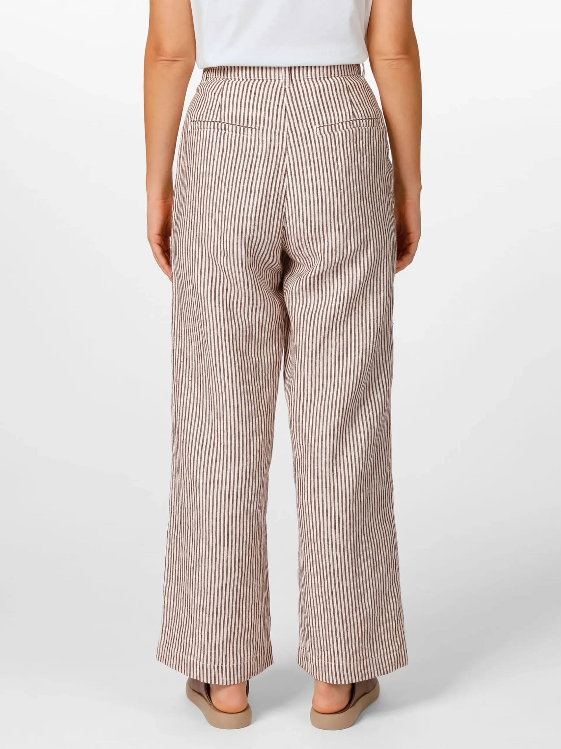 Lässig fallende, gerade geschnittene Leinenhose mit weitem Bein und eingewebten Längsstreifen. Knowledge Cotton Apparel lässt sie aus einem luftigen, mittelschweren Leinengewebe fertigen. Das verwendete Leinen stammt aus kontrolliert biologischem Anbau. Eine Bundfalte auf jeder Seite sorgt für einen guten und bequemen Sitz. Ausgestattet ist die Hose mit zwei Seitentaschen und zwei blinden Gesäßtaschen. Geschlossen wird sie mittels Reißverschluss und Hosenhaken.