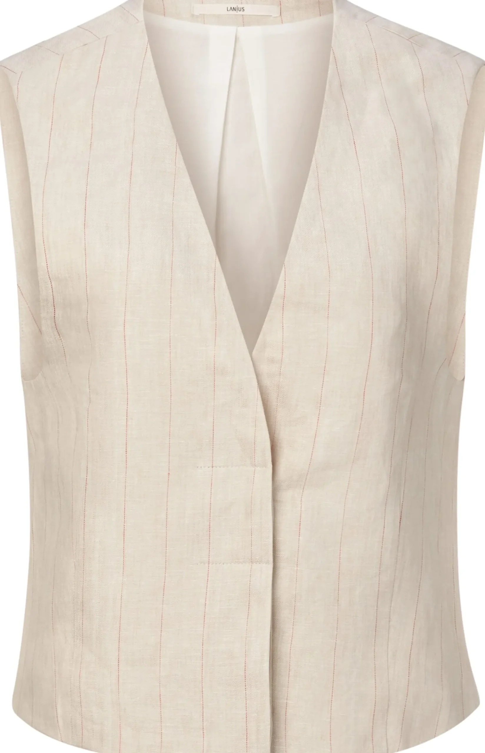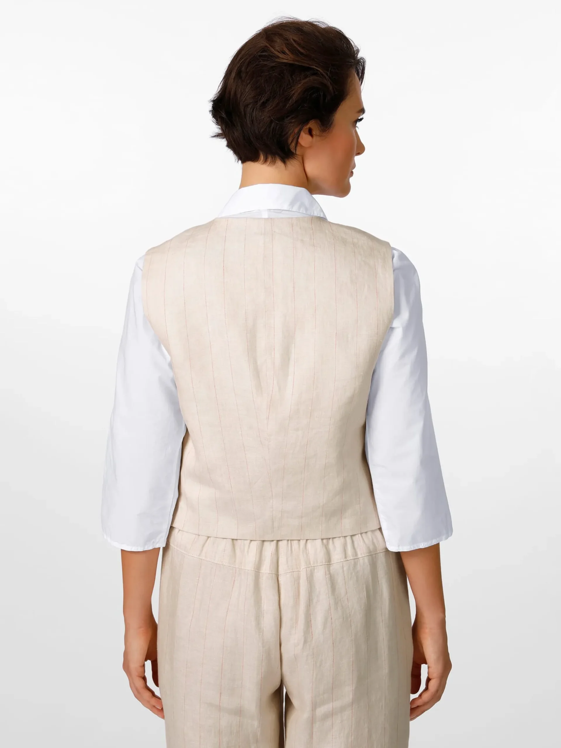 Früher gehörte zur Weste auch zwingend der passende Anzug, heute ist sie ein vollwertiges Kleidungsstück, das vielfältig kombiniert werden kann – mit Shirt oder Bluse, mit Stoffhose oder Jeans. Der Oberstoff dieser verdeckt geknöpften Weste besteht aus reinem Leinen. Dieser wird sowohl für die Front als auch für den Rücken verwendet. Leinen verfügt über herausragende feuchtigkeitsregulierende Eigenschaften und ist daher das Material der Wahl für die warme Jahreszeit. Das leichte Gewebe zeigt neben einem markanten Nadelstreifen die leinentypisch leicht unregelmäßige Struktur. Die Weste ist in lockerer Passform mit tiefem Armloch gearbeitet, was für einen komfortablen Sitz sorgt und ein bequemes An- und Ausziehen ermöglicht. Das Futter ist aus hautsympathischer Baumwolle gefertigt.