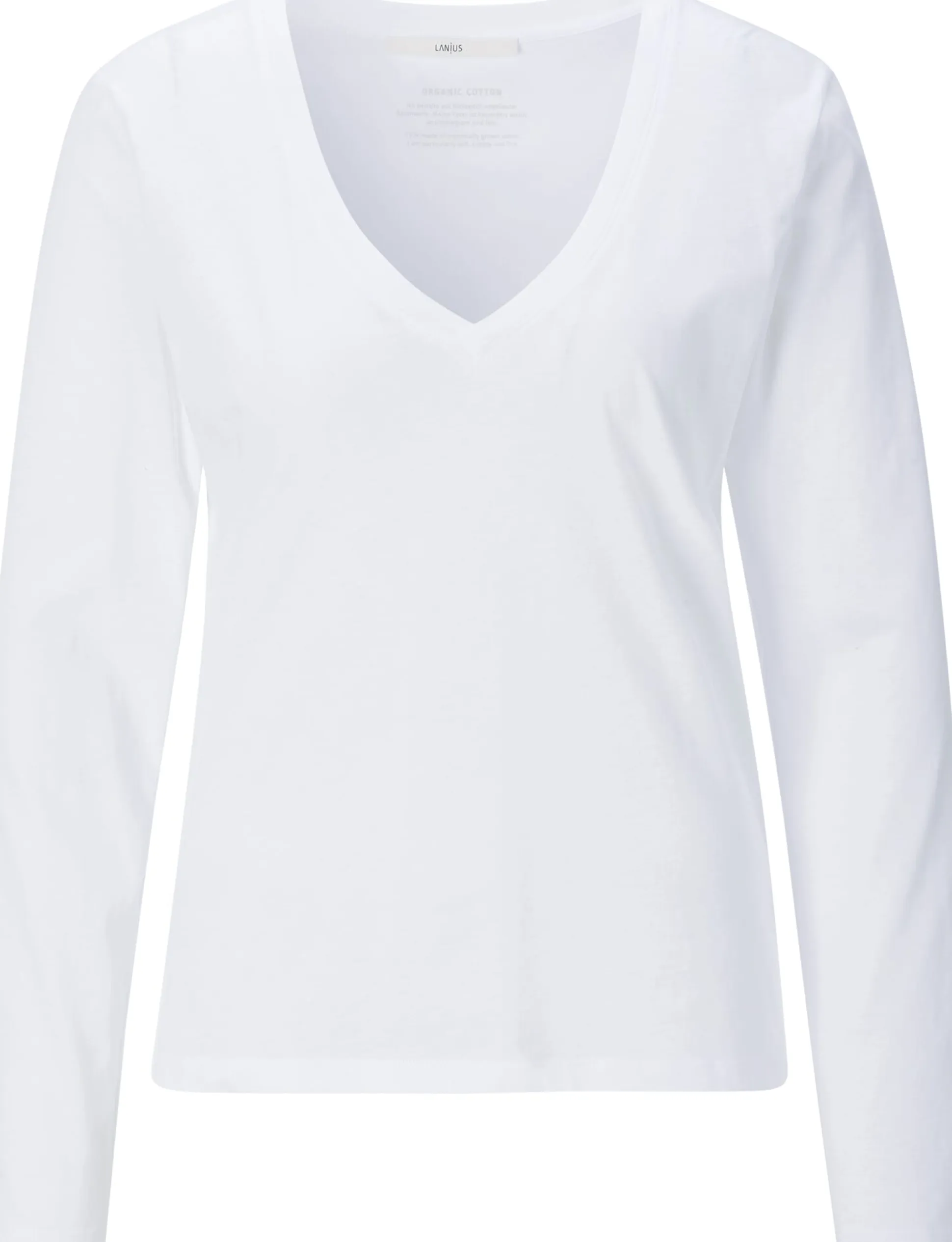 Dieses Langarmshirt aus hautsympathischer, kontrolliert biologisch angebauter Baumwolle vereint hohen Tragekomfort mit zeitloser Eleganz. Der leicht transparente Jersey liegt leicht und weich auf der Haut. Der V-Ausschnitt und die leicht taillierte Passform verleihen dem Shirt eine feminine Silhouette. Ein Basisstück für jede Jahreszeit, das vielseitig kombiniert werden kann – ob mit Jeans oder Rock, mit Blazer oder Pullunder.